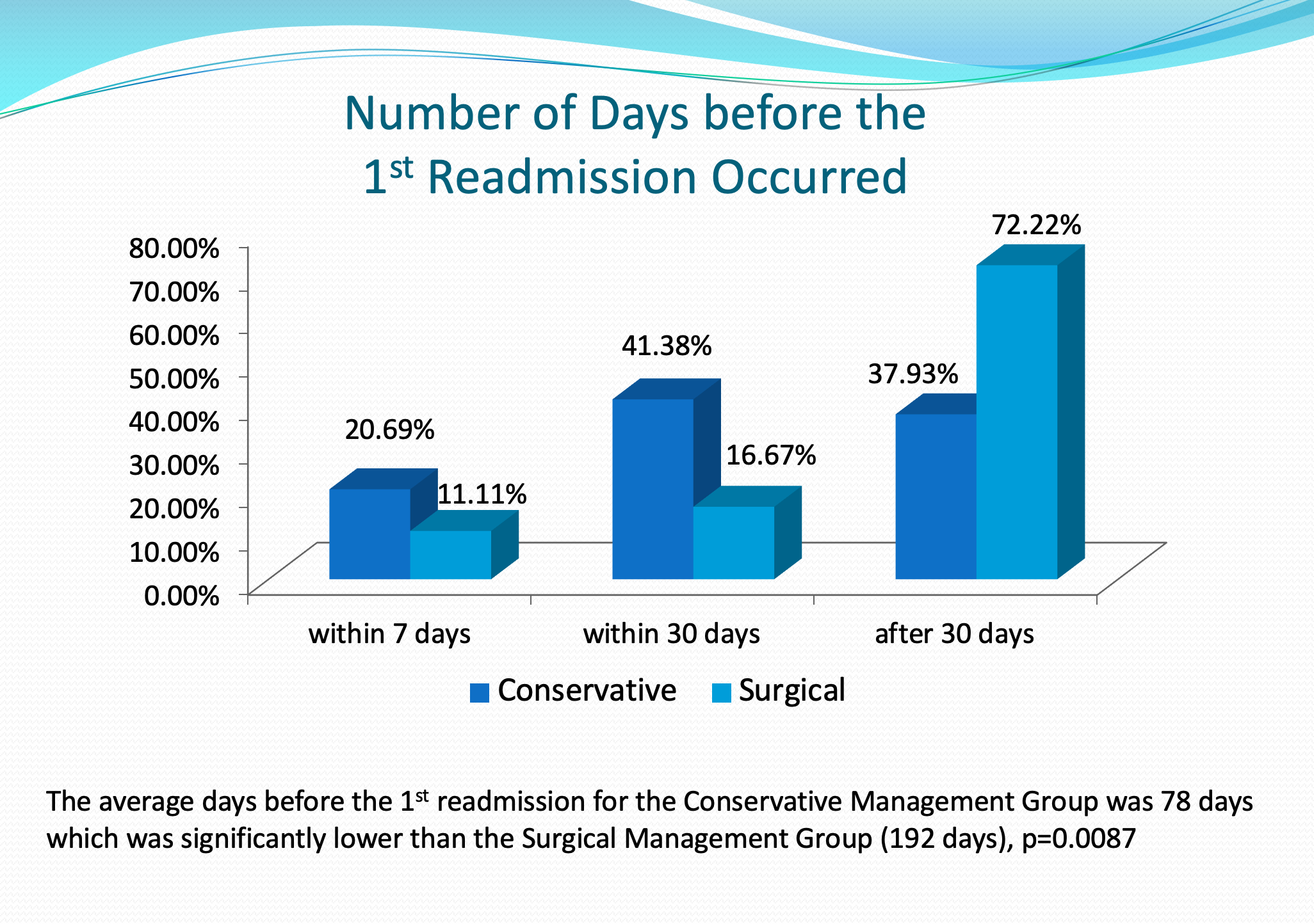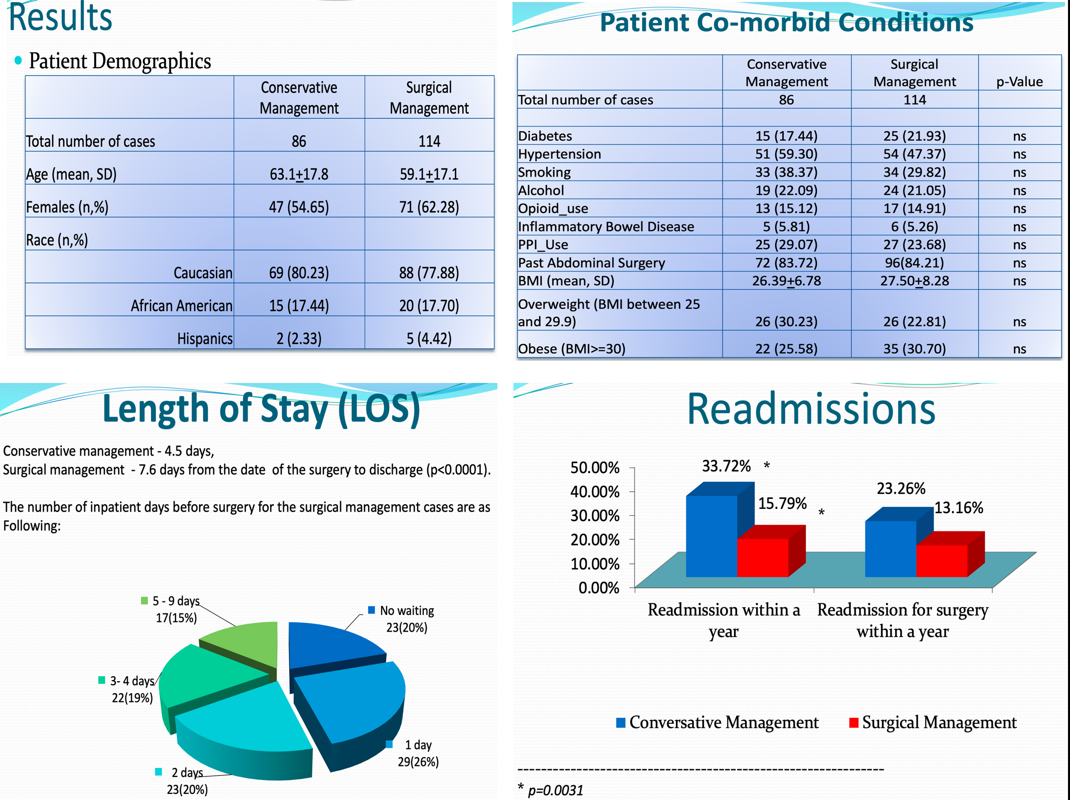 Methods: Data from 200 patients admitted to the Pinnacle Health Hospital between 2006 -2011were obtained from database using retrospective chart review. Further analysis included in this study were (1) Patient demographics including age, gender and racial background (2) Risk factors including diabetes, hypertension, smoking, alcohol use and BMI, proton pump inhibitor use, past abdominal surgery and inflammatory bowel disease. (3) Post surgery complication rate (4) Number of readmissions within a year (5) Number of readmissions for surgery (6) Average days before first admission. To compare the difference between the conservative and surgical approach, the students’ t-test, chi-squared, Fisher’s exact test, and univariate analysis were used. A p-value <=0.05 was considered statistically significant.