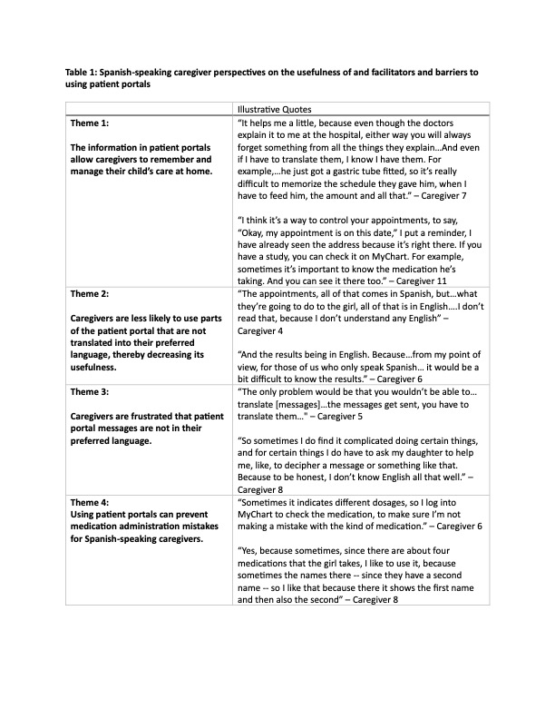 Results: We interviewed 20 caregivers. Four themes were identified: 1) The information in patient portals allow caregivers to remember and manage their child’s care at home; 2) Caregivers are less likely to use parts of the patient portal that are not translated into their preferred language, thereby decreasing its usefulness; 3) Caregivers are frustrated that patient portal messages are not in their preferred language; 4) Using patient portals can prevent medication administration mistakes for Spanish-speaking caregivers (Table 1).