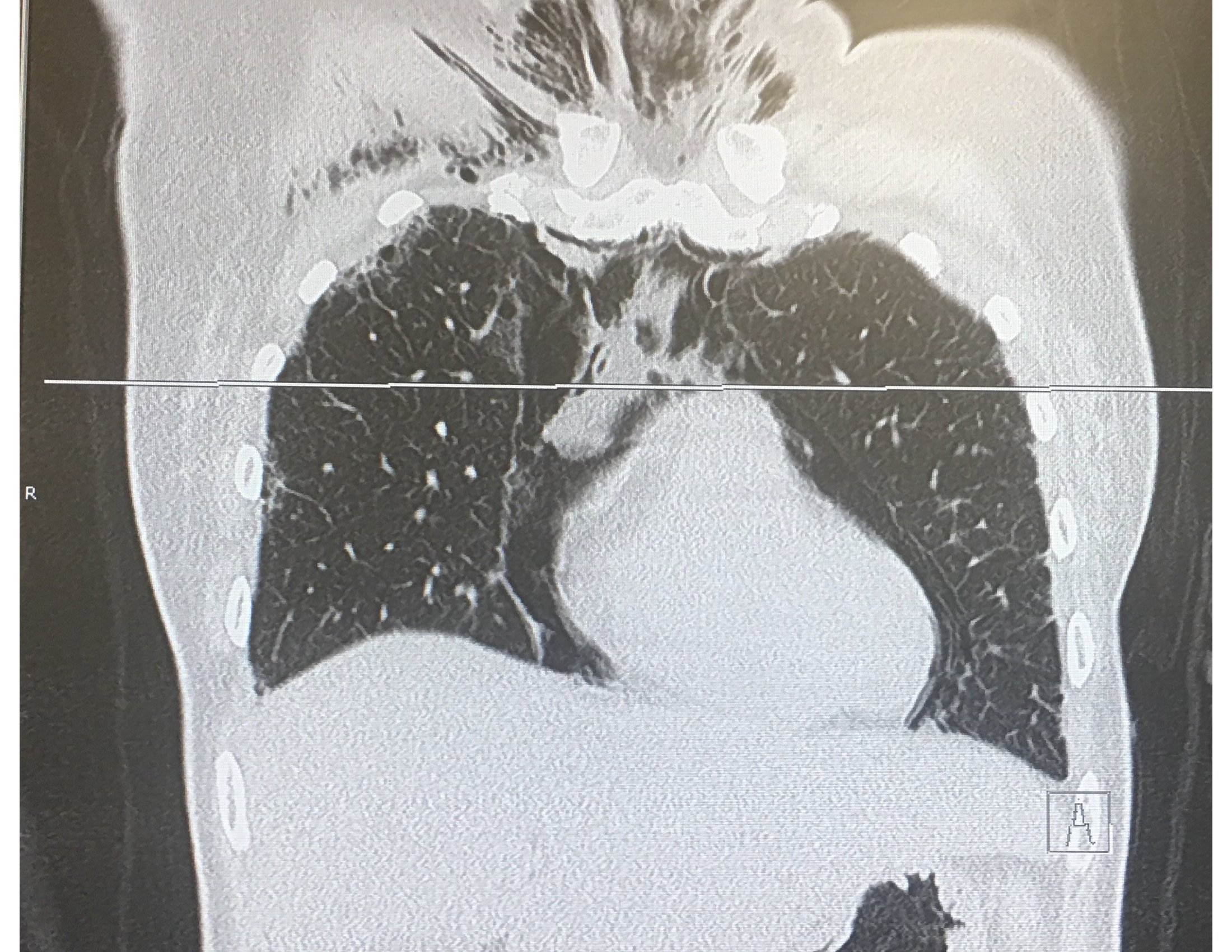 Case Presentation: A 33-year old female presented with 24 hours of subjective fever, severe neck, and chest pain. She was seen 6 months ago for arthralgia of the metacarpophalangeal, proximal interphalangeal and knee joints. Her home medication included Prednisone and Hydroxychloroquine prescribed for Lupus. Her physical examination demonstrated neck crepitus, bilateral crackles, ulcers in the tip of the fingers, erythroderma in elbows, knuckles and eyelids. CT chest revealed pneumomediastinum and right chest wall soft tissue emphysema. There were bilateral pneumothoraces and ground-glass opacities involving lower lobes bilaterally and bibasilar interlobar septal thickening. Laboratory data were significant for normal CPK levels. Anti-Jo1, PL-7, PL-12, Mi2, dsDNA antibodies were negative. ANA ab and Anti mitochondrial M2 were positive. O2 supplementation, Prednisone, Rituximab, and Mycophenolate were given since admission with marked improvement of the symptoms. Upon discharge, she was seen by her rheumatologist who diagnosed Antisynthetase syndrome after new laboratories were ordered.