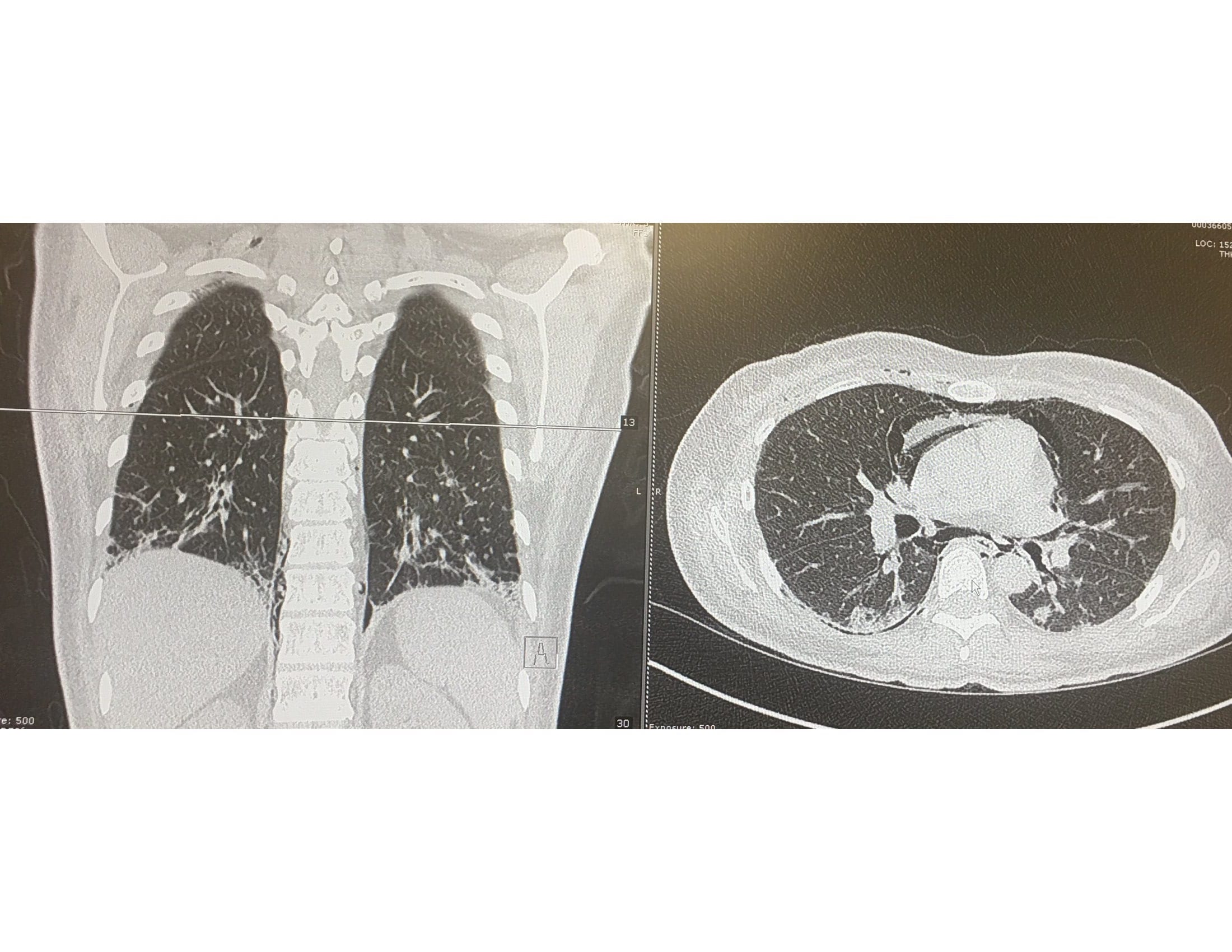 Discussion: Antisynthetase syndrome is a very uncommon disease, with a reported annual incidence of two new cases per one million adults. This is probably an underestimation caused by a lack of familiarity with this syndrome which criteria were described less than ten years ago. Connor’s criteria include the presence of antibodies against aminoacyl t-RNA synthetase along with features of interstitial lung disease, myositis, Raynaud’s phenomenon, and arthritis. Anti-histidyl antibody (Jo-1) is the most commonly detected antibody (30%).Clinical features of this patient including interstitial lung disease, Goitron papules, mechanical hands, and polyarthritis suggested Antisynthetase syndrome. Imaging studies supported the diagnosis because common findings reported in the literature include ground-glass opacities and interlobar septal thickening as seen in this patient. However, this is a challenging scenario because the patient did not meet diagnostic criteria due to a lack of specific antibodies. This could be explained by autoantibody levels fluctuation depending on disease activity. Also, only a few aminoacyl transfer RNA synthetase antibodies have been identified, many are still not available for laboratory detection.In terms of treatment, there are not clinical trials due to the rarity of this condition. However, cases reported indicating that high dose steroids are the most effective medication in controlling acute pulmonary disease associated with this syndrome. They are used in combination with mycophenolate, and rituximab to improve the prognosis. Complications like spontaneous pneumothorax are managed with oxygen and supportive therapy on stable patients.