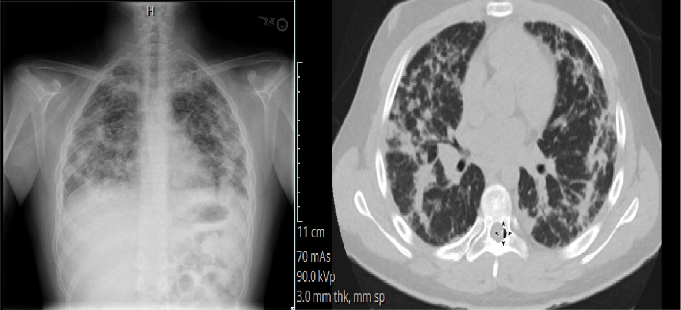 Case Presentation: A 14-year-old male with history of juvenile ankylosing spondylitis (JAS) and asthma presented to the hospitalist service with four weeks of fever, weight loss, dyspnea, wheezing and cough. He was admitted one week prior for treatment of bilateral pneumonia and was continued on antibiotics after discharge for a ten day course. He had worsening cough, dyspnea and fever several days later, so he presented for further evaluation. Medications included inhaled beclomethasone, albuterol as needed, sulfasalazine started two months prior and adalimumab started one month prior to initial presentation. No tobacco or drug use or recent travel. Vaccinations were up to date.