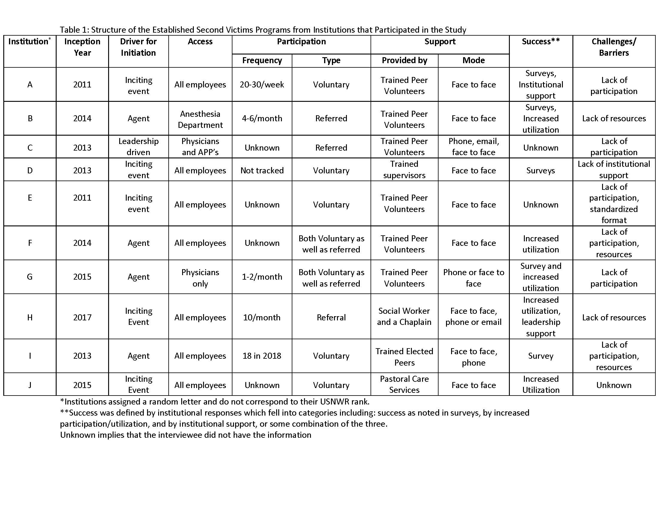 Methods: The 2017 top 20 Honor Roll Hospitals were identified on the USNWR website. To obtain a contact, we searched for phrases such as “Second Victim”, “Safety”, “Quality”, and “Risk” on institution websites or contacted the hospital operator to identify relevant individuals. Once identified, individuals agreed to recorded phone interviews, which were transcribed and independently reviewed by 2 authors. A text-based analysis of transcriptions was performed, identifying quantitative information and qualitative themes that unified or distinguished programs, including information on participation, accessibility, content, determinants of success and challenges.
