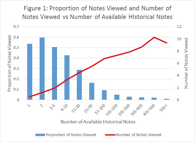 Results: We identified a total of 4,318 hospital admission H&Ps over the 6 month time period. On average, patients had a mean 147 [range 0-1984] PTA notes available in the EHR at the time of their admission. Physicians on average viewed 5.73 PTA notes [range 0-50] when writing their admission H&Ps, 3.9% of available notes. Historical H&Ps (18.8%) and discharge summaries (19.9%) were viewed more often than progress notes (5.5%). H&P authors read more notes as the number of available notes increased (Figure 1). However, this corresponded with a smaller proportion of available notes (Figure 1).