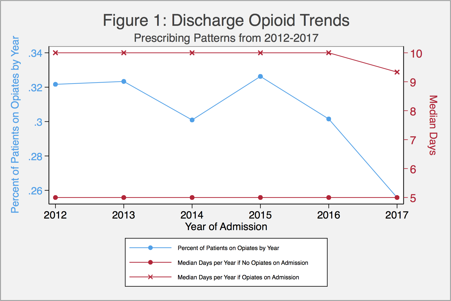 Conclusions: The percent of patients discharged on opioids from a hospital medicine service has declined over time, with a sharper drop from 2016 to 2017 than in years prior. The median number of days among those patients discharged on opioids has also declined over time. Patients on opioids at the time of admission are discharged with higher median days of opioids than those not previously on opioids – a trend that continued beyond the release of the 2016 CDC guidelines.