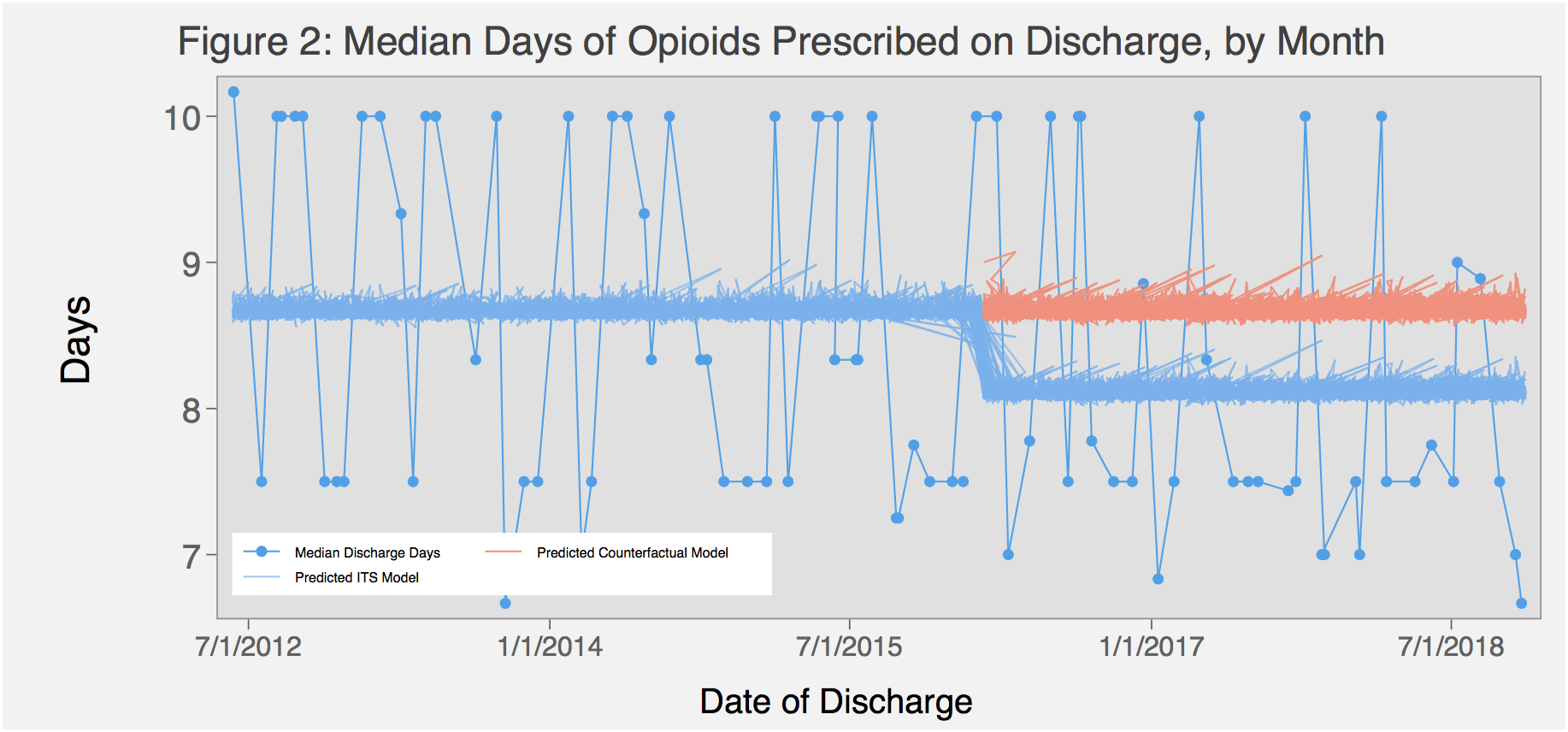 Methods: We used the electronic health record to identify all patients hospitalized on the acute care medical service at a 600-bed tertiary care hospital from 2012-2017, and stratified by whether they were on opioids at the time of admission according to provider medication reconciliation records. Patients were excluded if they had an ICD9 or 10 code for cancer-related pain or sickle cell disease, or who were on hospice or followed by the palliative care service. We calculated the number of opioid days supplied to the patient at discharge based on the discharge prescription signature and number of pills. All opioid prescriptions were standardized to morphine milligram equivalents (MMEs). We then calculated the median opioid days supplied at discharge by month, from 2012 to 2017. Multivariable Poisson regression analysis was used to assess for temporal trends in likelihood of opiate prescription and median days supplied, with an interrupted time series approach to test whether there was a significant change at the intervention point of March, 2016.