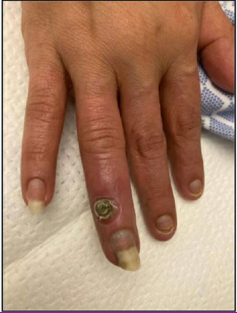 Case Presentation: A 57-year-old female with end-stage renal disease (ESRD) on hemodialysis and a history of calciphylaxis presented with a non-healing wound on her right hand. Two months prior, she developed a wound on the dorsal surface of her right fourth finger without antecedent trauma. The lesion became painful and discolored, resistant to multiple courses of oral antibiotics. Examination revealed a dry papulonodular lesion with a central keratin plug.Her AV fistula was well-functioning, and laboratory tests were within her baseline range. MRI ruled out osteomyelitis, while biopsy showed epidermal ulceration and dermal fibrosis, raising concerns about ischemia. The patient noted worsening symptoms during dialysis. An AV fistula duplex ultrasound revealed poor distal brachial artery blood flow. Manual compression of the AV fistula restored distal waveforms, confirming dialysis-associated steal syndrome (DASS). She underwent fistula plication and proximalization to enhance distal blood flow.