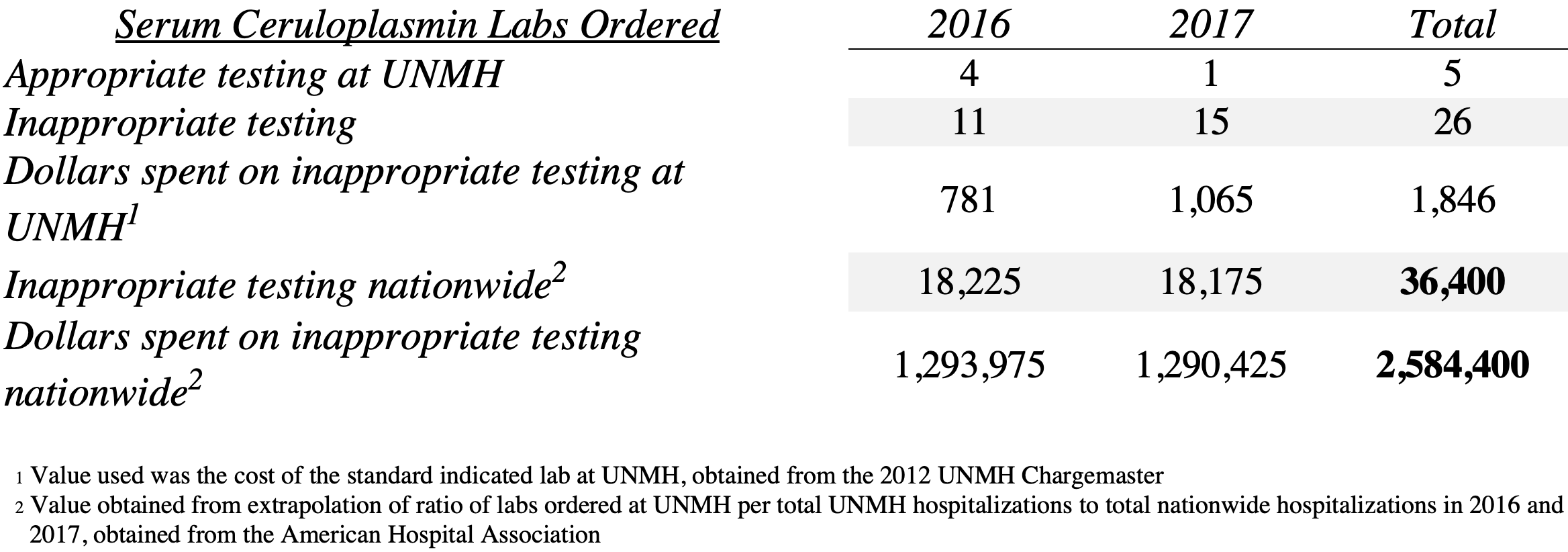 Results: We identified 31 serum ceruloplasmin labs ordered in this cohort of 144 patients. Of those 31 labs, only 5 (16%) were warranted. Overall, this shows that only about 3% of patients should have received this lab test; however, 22% of the total patients received this test. We then extrapolated the same calculations across the US, using the 2016 and 2017 AHA total hospital admissions. Additionally, we calculated the charge of the excessive inappropriate lab work-up both at UNMH and across the US.