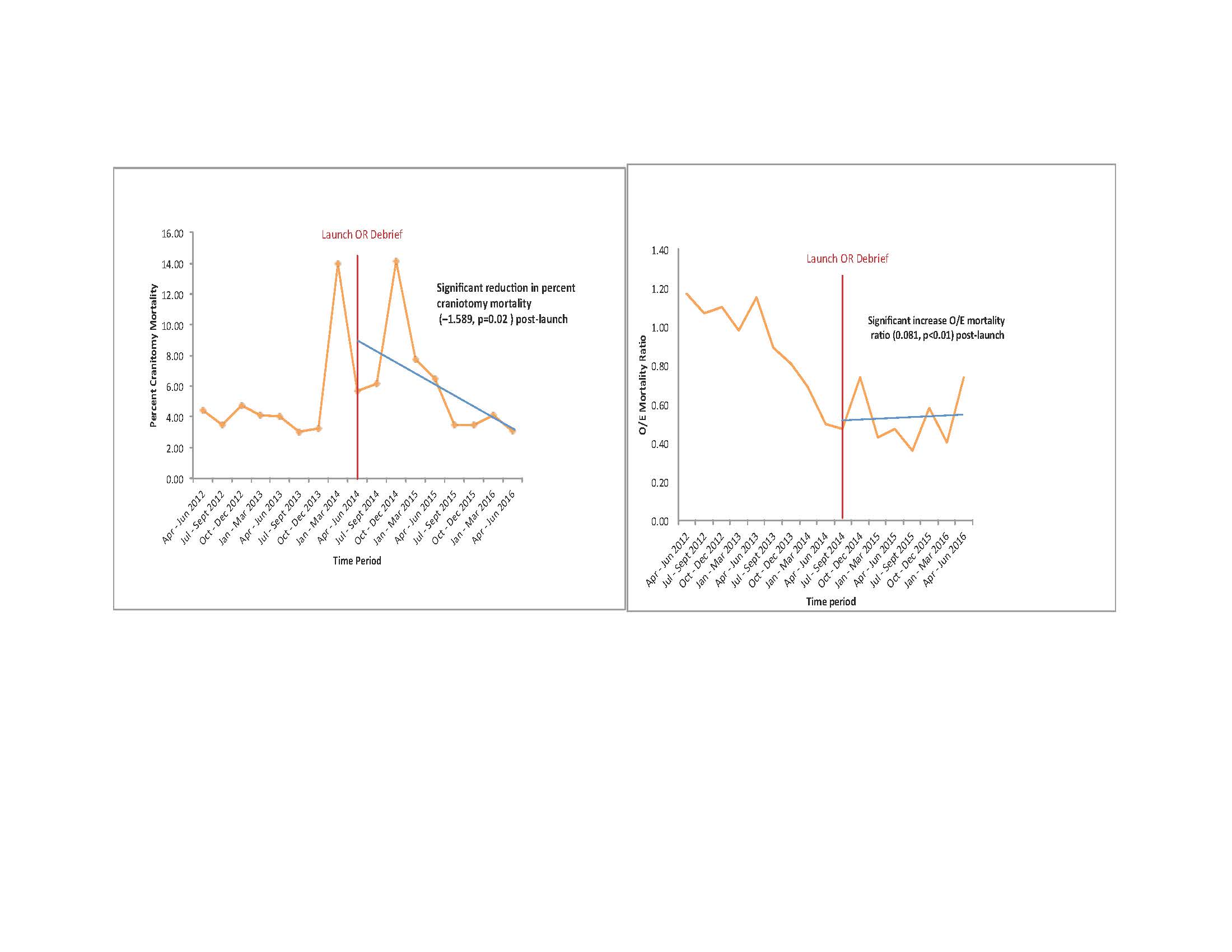 There were no clear trends in patient satisfaction scores as a result of education module prescription. We found divergent results following launch of the OR debrief related to mortality. We noted a significant reduction in the percent craniotomy mortality following launch of the OR debrief (p=0.02) and significant increase in overall mortality observed-to-expected (O/E) ratio (p<0.01) during the same time period (Figure 1); however, overall mortality O/E remained less than 1. There were no significant changes in 30-day readmission rate, length of stay index, direct cost index, and perioperative VTE and hematoma rates due to the OR debrief. We also found no clear trends between completion of individual elements of the ABC checklist and patients’ clinical outcomes.