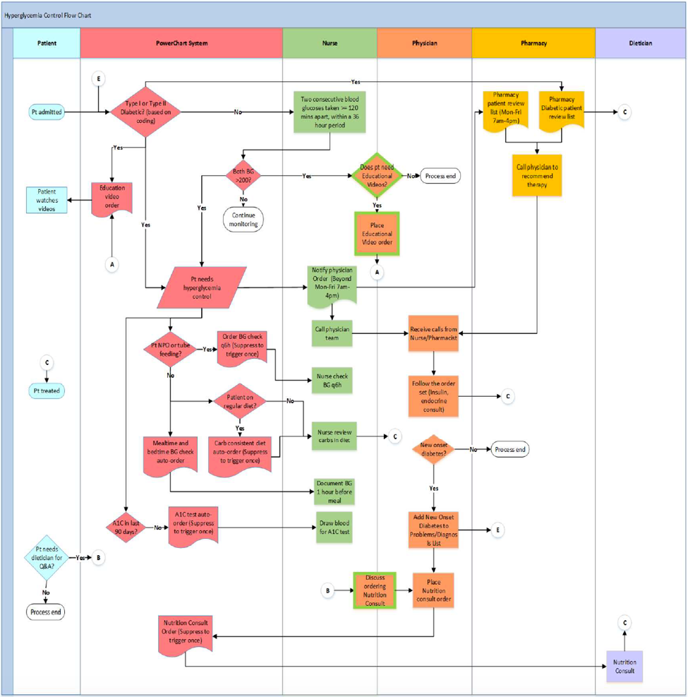 Methods: The control group consisted of Type-1 (T1DM) or Type-2 (T2DM) diabetics present on the Cardiology unit or Cardiology ICU between June 2017-January 2018. The intervention group consisted of patients on these same floors after August 2018 identified based on 1 of 2 criteria: diagnosis of T1DM/T2DM or having had at least 2 consecutive blood glucose (BG) readings >200 mg/dL within 2-36 hours apart. Patients fulfilling either criteria were excluded if diagnosed with DKA or HHNK, as well as if on IV insulin. Upon patient admission, the following were automatically placed via EMR: diabetes education (dietary, nursing, and videos); pharmacy medication review; basal, bolus, and correction scale per pharmacy recommendation; hemoglobin A1C level if undocumented within 90 days; and carb-consistent diet with mealtime and bedtime BG checks.