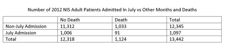 Conclusions: In the 2012 NIS data, the “July effect” does not occur in the case of patients who are admitted for STEMI. Being admitted in July to teaching hospitals for STEMI is not associated with an increased risk of death during hospitalization.