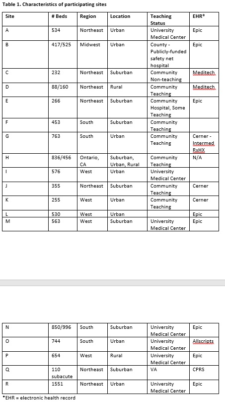 Table 1 displays the 18 participating sites’ characteristics. Sixteen sites have implemented 3 to 15 toolkit components, with 14 sites implementing dedicated BPMH takers and 13 providing audit and feedback on the specific roles and responsibilities among clinical staff (Table 2).