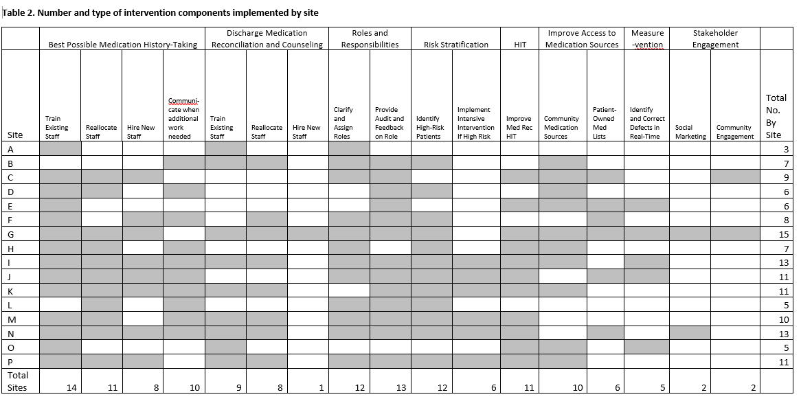 Conclusions: A multi-center medication reconciliation QI initiative using a best practices toolkit and mentors was successfully implemented across 18 medical centers. The most commonly implemented components were incorporating dedicated BPMH takers and defining the roles and responsibilities among clinicians. Different personnel may be needed if sites wish to implement community-based interventions.