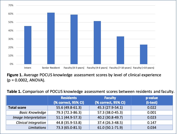 Conclusions: Our test revealed that, while resident physicians at our institution have limited knowledge and require supervision, our hospital medicine faculty had a significantly lower baseline knowledge than the same residents they supervise. Specifically, hospitalist were more deficient in domains of basic knowledge, image interpretation, and importantly, understanding of limitations. Hospitalists more recently out of training were seen to score higher than those with more attending experience, which may reflect the recent wave of POCUS training in internal medicine resident programs. As resident physicians continue to gain valuable new skills in POCUS, this data argues for comprehensive faculty POCUS curriculum with an emphasis on appropriate use, knowledge of limitations, and supervision to address and prevent this supervision safety gap.