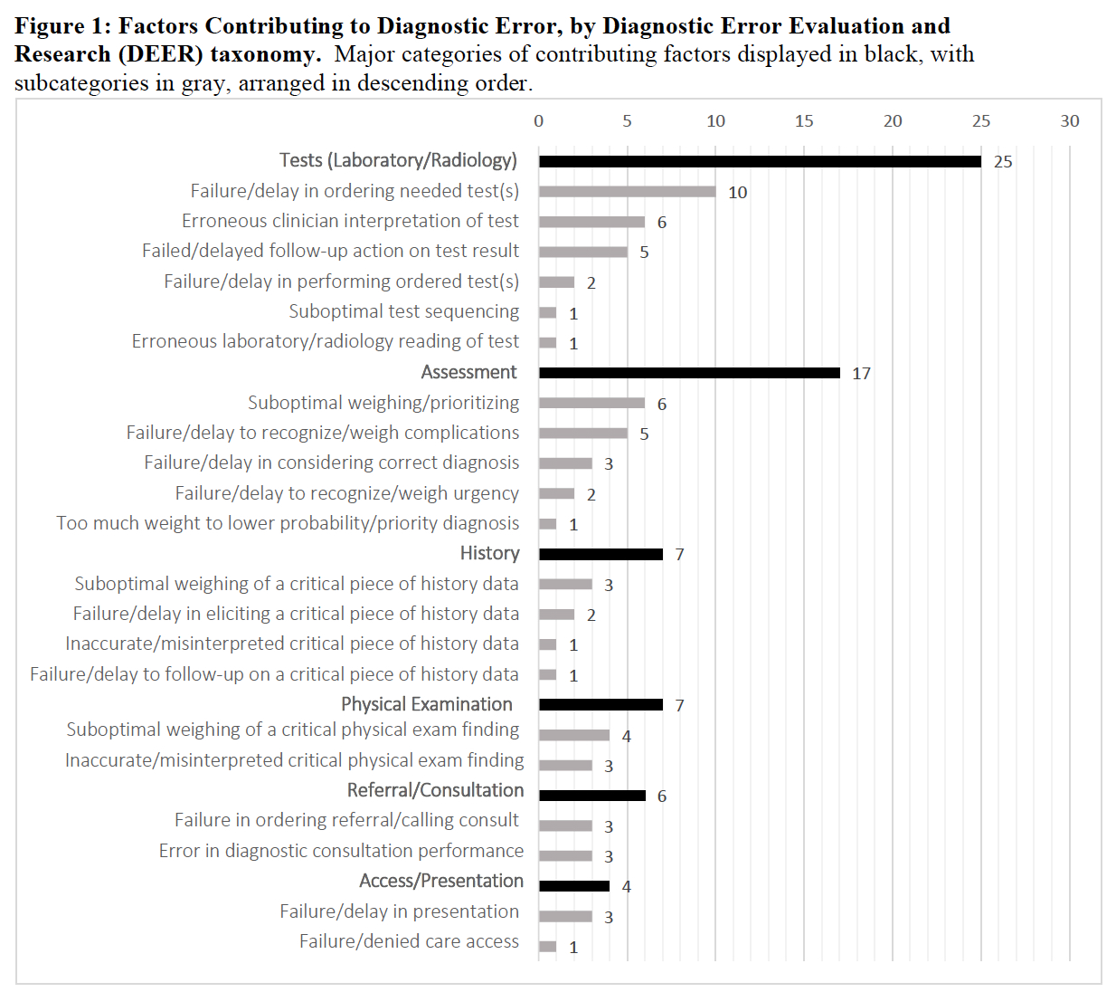Results: During the study period, of 5663 admissions to the medical service, we identified 261 cases of 7-day readmission (4.6%), of which 258 (98.9%) were reviewed. A total of 18 (7.0%) admissions contained diagnostic error. In 17 of the 18 cases (94.4%), the error was judged as having “moderate” impact, such as short-term morbidity, increased length of stay, or invasive procedure, and 1 had no impact. In the DEER taxonomy, the most common culprit areas within the diagnostic process contributing to error were in Laboratory/Radiology Tests (25) and Assessment (17) (Figure 1). The most common subcategories contributing to error were failure/delay in ordering needed test(s) [10, 56%], erroneous clinician interpretation of test(s) [6, 33%], and suboptimal weighing/prioritizing [6, 33%] (Figure 1). Diagnostic errors represented a breadth of diagnoses; no single diagnosis was repeated among the 18 identified errors.