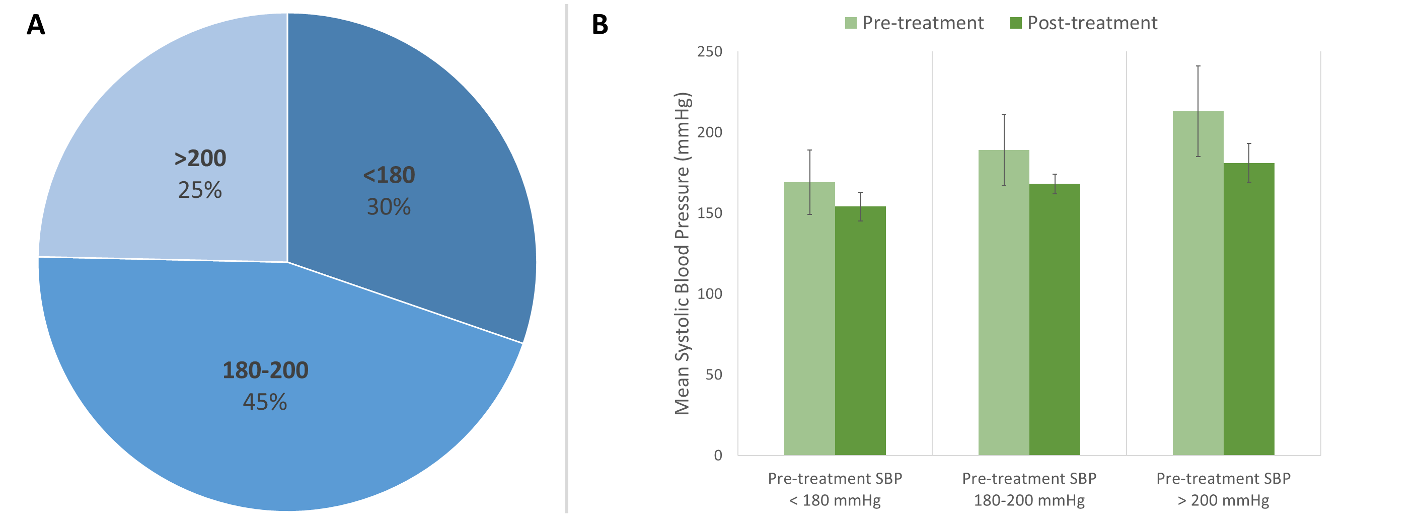 Results: We identified 3,774 patients with greater than or equal to 1 episodes of asymptomatic elevated BP. Of these, 279 (7.4%) received IV hydralazine and/or labetalol during their hospitalization. On average, patients received 2.4 doses of IV antihypertensives (range: 1-30); 60% of doses administered were hydralazine. The majority (426 [63%]) were ordered on a standing “prn” basis, while 248 (37%) were ordered as a one-time dose. Mean pre-treatment BP was 189/90 ± 18/19 mmHg; 30% of pre-treatment systolic blood pressures (SBP) were < 180, and 75% were < 200 mmHg (see figure 1). BP fell on average by 22/9 mmHg, with mean post-treatment BP of 167/81 ± 25/18 mmHg; however, 17% had either no change, or an increase in BP, following treatment. Eighty-seven patients (14%) had a decrement in SBP >25%.