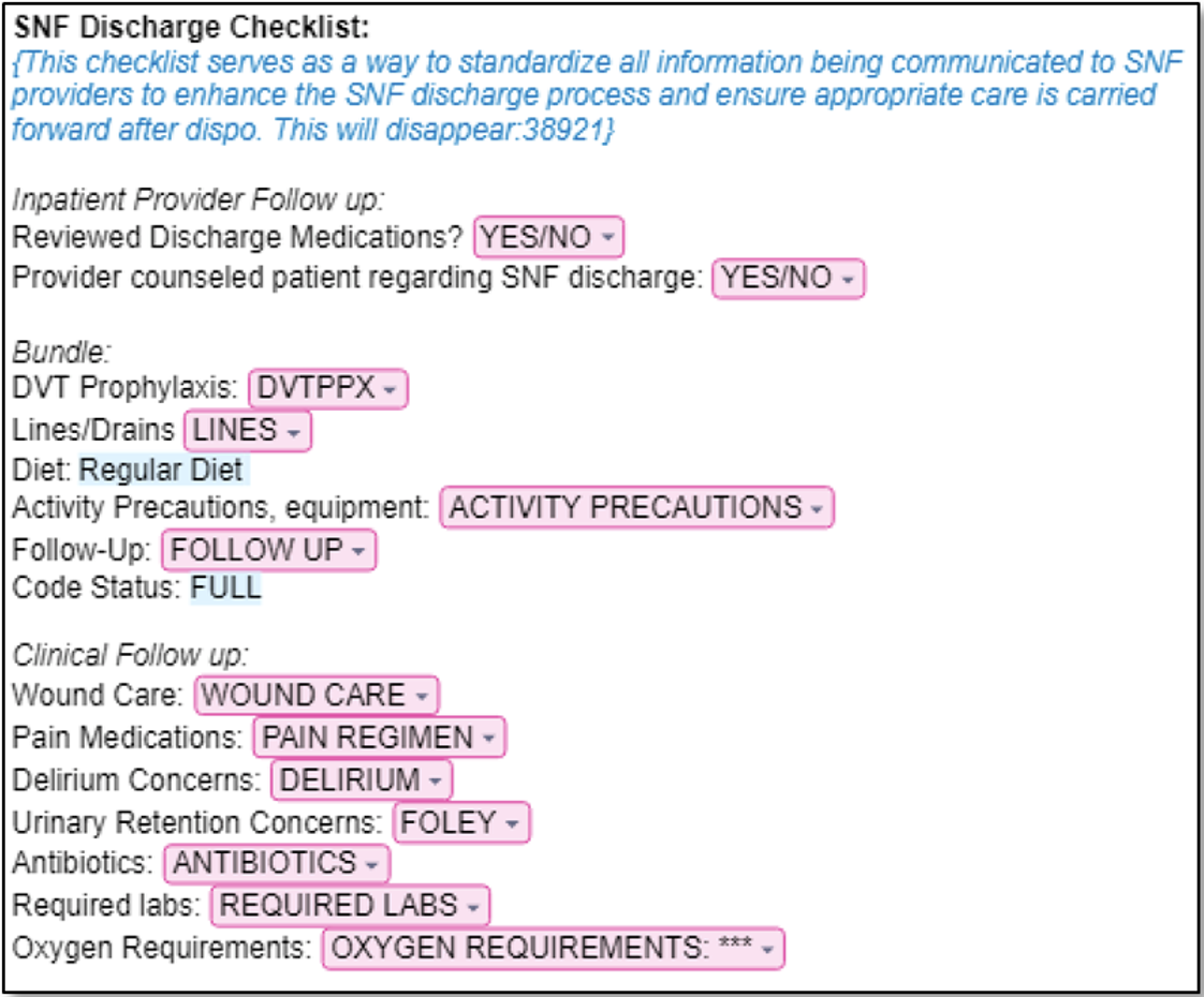 Description: PHASE 1: NEEDS ASSESSMENT In September 2023, our resident-led quality improvement team surveyed internal medicine residents on the medicine teaching service (n=53) and providers at two local SNFs (n=11) to better understand the gaps in SNF discharge communication. 40% of residents did not feel confident in knowing what to include in their documentation to SNF providers and only 31% of residents were comfortable counseling patients about what to expect at a SNF. 75% of SNF providers were confident that the discharge summary would contain a clear hospitalization summary but less confident about it including an adequate pain regimen (60%), follow-up referrals (58%), and wound care recommendations (54%) (Figure 2). PHASE 2: DEVELOPMENT OF SNF DISCHARGE CHECKLIST Through survey results and collaboration with SNF clinicians and hospital-based case managers, nurses, and clinicians, we designed a standardized SNF discharge checklist for resident teams in the form of an electronic health record (EHR)-based dotphrase. The dotphrase prompted residents to insert key information, such as wound care recommendations (Figure 1). Residents were initially asked to manually include this dotphrase (.SNFDischargeChecklist) at the top of discharge summaries for patients discharging to SNF and review it during verbal handoffs to SNF providers. PHASE 3: TACTICS TO INCREASE UTILIZATION Following the dotphrase launch, our team utilized awareness campaigns, monthly emails, reminder pages, and gamification to encourage dophrase uptake across resident teams. By March 2024, the dotphrase was updated to now auto-populate into all discharge summaries whenever SNF was selected as the discharge location, eliminating the need to manually insert the dotphrase to get the checklist to appear. From October 2023 to May 2024, monthly utilization of the dotphrase increased from 41% to 88%, with a total cumulative utilization rate of 57%. PHASE 4: EVALUATION Residents and SNF providers were re-surveyed 8 months after the dotphrase launch. Compared to the pre-intervention period, significantly more residents reported including key information in the discharge summary. Interpretation of SNF provider surveys was limited by a small sample size. Some SNF providers endorsed smoother hand-offs, but there was room for improvement in counseling patients on realistic expectations around SNF-level care (Figure 2).
