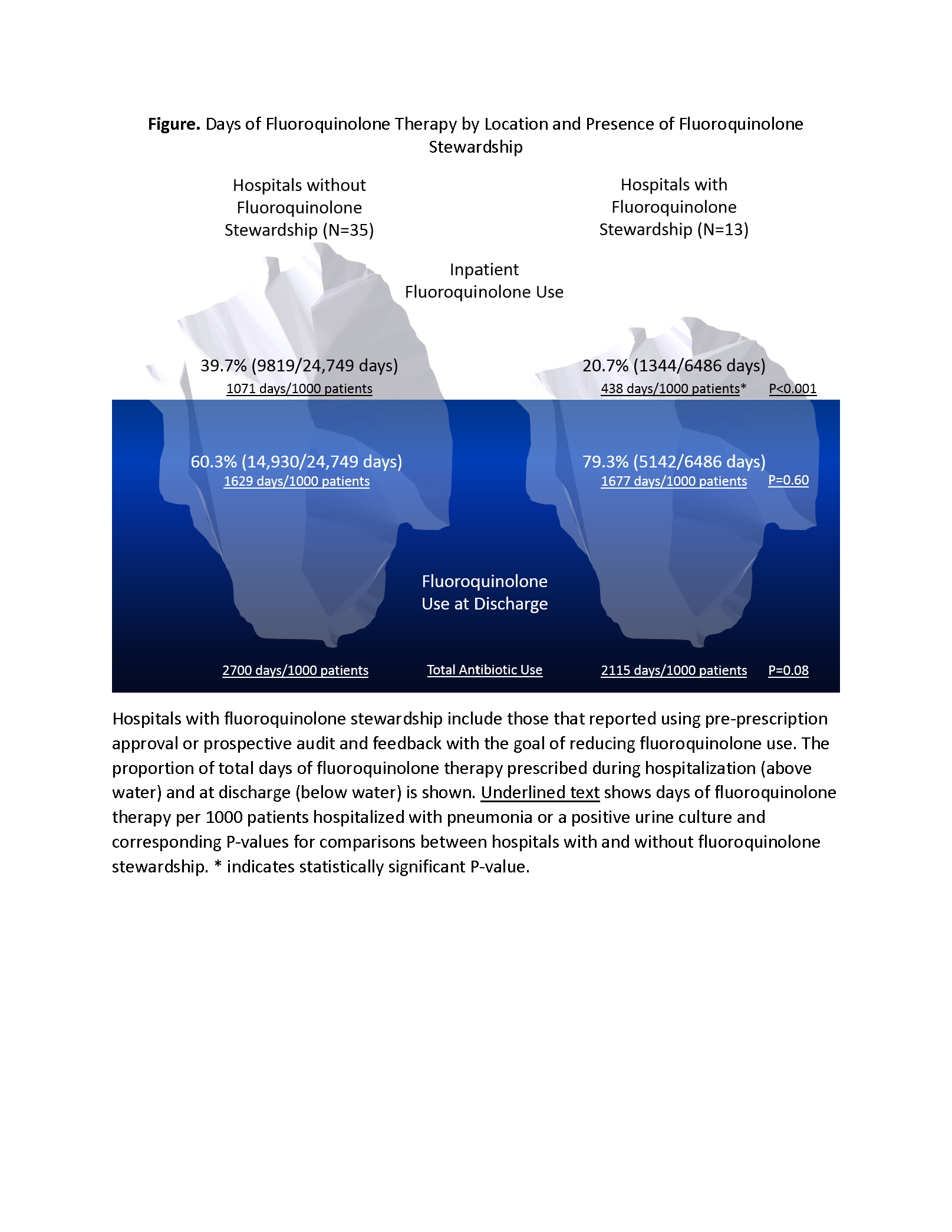 Conclusions: Stewardship activities targeting fluoroquinolone use were associated with less inpatient, but not discharge, fluoroquinolone prescribing. Hospitals with fluoroquinolone stewardship had more new fluoroquinolone starts and longer fluoroquinolone durations at discharge—limiting the overall effect of fluoroquinolone stewardship. By failing to address antibiotic prescribing at discharge, inpatient stewardship may be focused on just the tip of the iceberg.