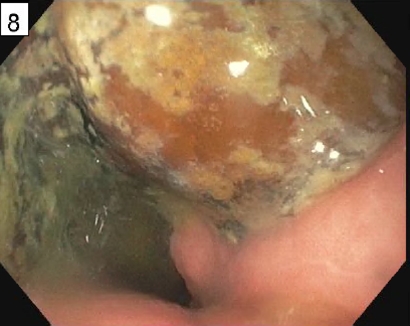 The patient continued to have nightly fevers for five days despite appropriate antibiotics and negative surveillance blood cultures. Transthoracic echocardiogram (TTE) revealed a small mobile mass attached to the eustachian valve (Fig. 1). With severe iron deficiency anemia and cultures positive for group D Streptococcus, colonoscopy and esophagogastroduodenoscopy (EGD) were performed which ruled out malignancy but showed a foreign body eroding through the gastric lumen (Fig.2). The patient was taken into surgery for laparoscopic removal of the gastric band without any complication.