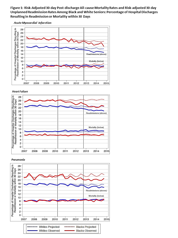 Results: Black seniors had 627,373 index discharges (9.7%) while white seniors had 5,845,130 (90.3%). For AMI, HF, and pneumonia, respectively, pre-HRRP mortality rates were 7.04%, 6.69%, and 8.08% among black seniors and 7.47%, 8.56%, and 8.27% among white seniors.