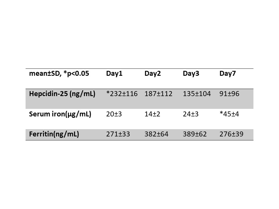 Results: Pathogens detected by blood cultures were Esherichia coli (n=16), β-streptococcus (n=5), Klebsiella pneumonia (n=2), Enterococcus faecalis (n=2), Proteus mirabillis (n=1), Staphylococcus aureus (n=1), MRSA (n=1), Streptococcus anginosus (n=1), Enterobactor cloacae (n=1), GNR (n=1). Hepcidin-25 levels on day1 were highest and decreased significantly during hospital days (day1 232±116 ng/ml, day2 187±112 ng/ml, day3 135±104 ng/ml, day7 91±96 ng/ml P<0.05). Serum iron levels on day1, 2, and 3 were significantly lower than on day 7 (day1 20±3 µg/dl, day2 14±2 µg/dl, day3 24±3 µg/dl, day7 45±4 µg/dl P<0.05). Differences in serum ferritin levels within each day were not significant (day1 271±33 ng/ml, day2 382±64 ng/ml, day3 389±62 ng/ml, day7 276±39 ng/ml).