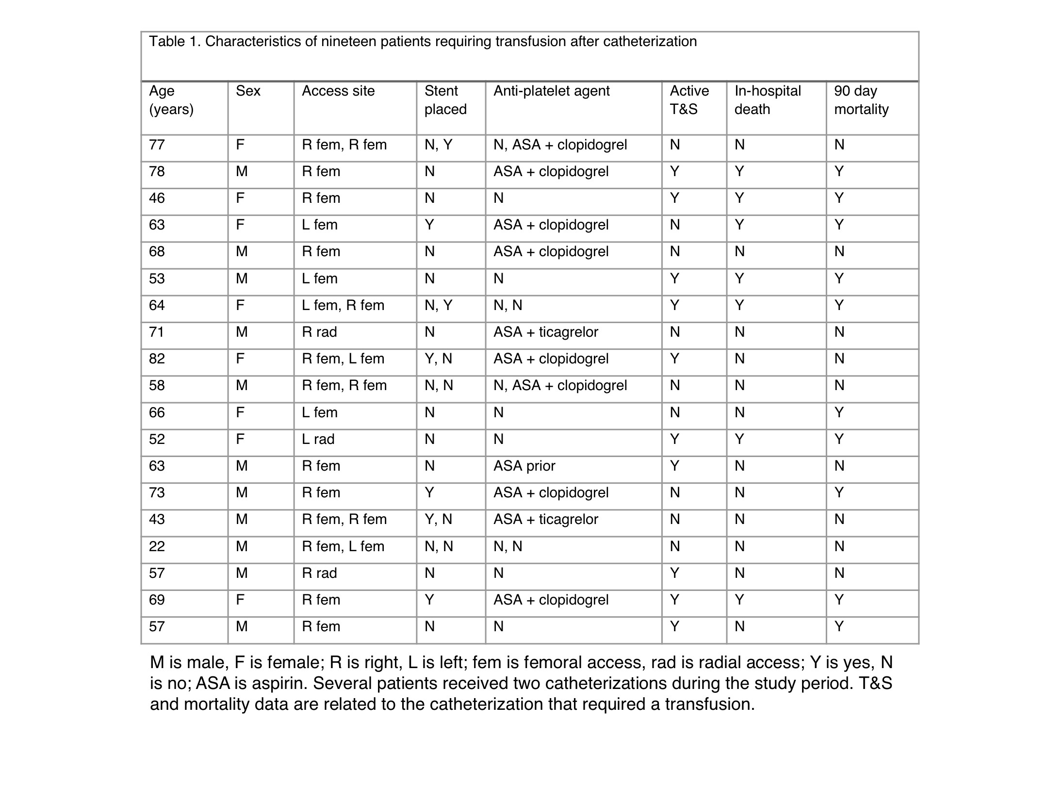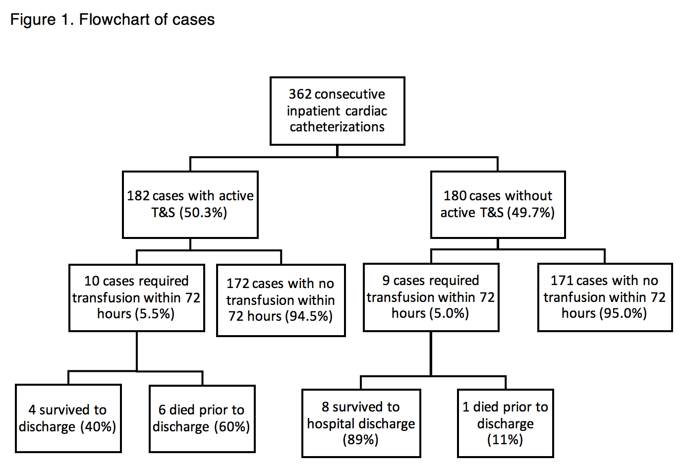 Results: A T&S was active (drawn within 72 hours of procedure) in 180 of 362 (49.7%) inpatient CC cases (Figure 1). There were 19 total patients that required a blood transfusion within 72 hours of CC. Ten of those 19 patients (Table 1) had an active T&S at the time of catheterization. Additionally, nine bleeding complications directly related to CC requiring transfusion out of 362 procedures (2.5%), which is consistent with prior large multicenter published studies. Of the 19 patients that required transfusion, seven died during the admission (36.8%), while ten died within 90 days of catheterization (52.6%). Further, there was a trend towards increased in-hospital mortality among those patients who had an active T&S (p=0.057). Of those nine patients that experienced bleeding complications related to CC, seven (77.7%) survived to hospital discharge.