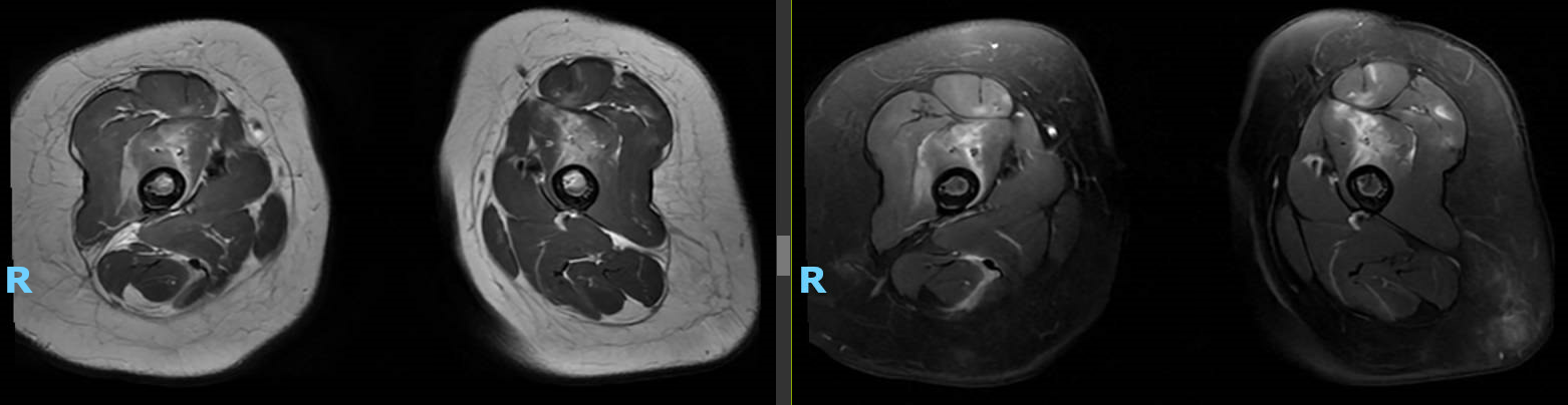 Discussion: The differential diagnosis for this toddler with prolonged refusal to walk following a fall was initially broad, including trauma, infectious/inflammatory etiologies, neurologic disorders, toxic exposure, and hematological disease/malignancy. The failure of symptoms to improve prompted imaging revealing extensive muscle inflammation suggestive of an inflammatory (post-viral or autoimmune) vs. non-inflammatory myopathy. Further labs at this time were notable for continued normal CK and elevated AST with aldolase and LDH elevated (hemolyzed). An extended myositis panel revealed positive anti-MDA5 antibodies, and muscle biopsy confirmed diagnosis of juvenile dermatomyositis (JDM). JDM is a rare, autoimmune disease characterized by proximal muscle weakness and classic skin rashes but can affect multiple organ systems. Serologic testing may demonstrate elevated muscle enzymes and presence of myositis-specific/myositis-associated antibodies (1). Prevalence of anti-MDA5 antibodies in JDM patients varies based on ethnicity (7% in predominantly Caucasian cohorts vs. 38% in a Japanese cohort) and the associated clinical phenotype has been shown to include cutaneous lesions and interstitial lung disease with milder muscle disease and lower CK levels (2,3). Several aspects of this patient’s presentation were notable including the lack of characteristic skin lesions (e.g. Gottron’s papules, heliotrope rash, skin ulcerations) at the time of presentation as well as the young age at onset of symptoms (average onset of JDM is 7 years and anti-MDA5 antibodies have been associated with later onset of symptoms) (1,2).
