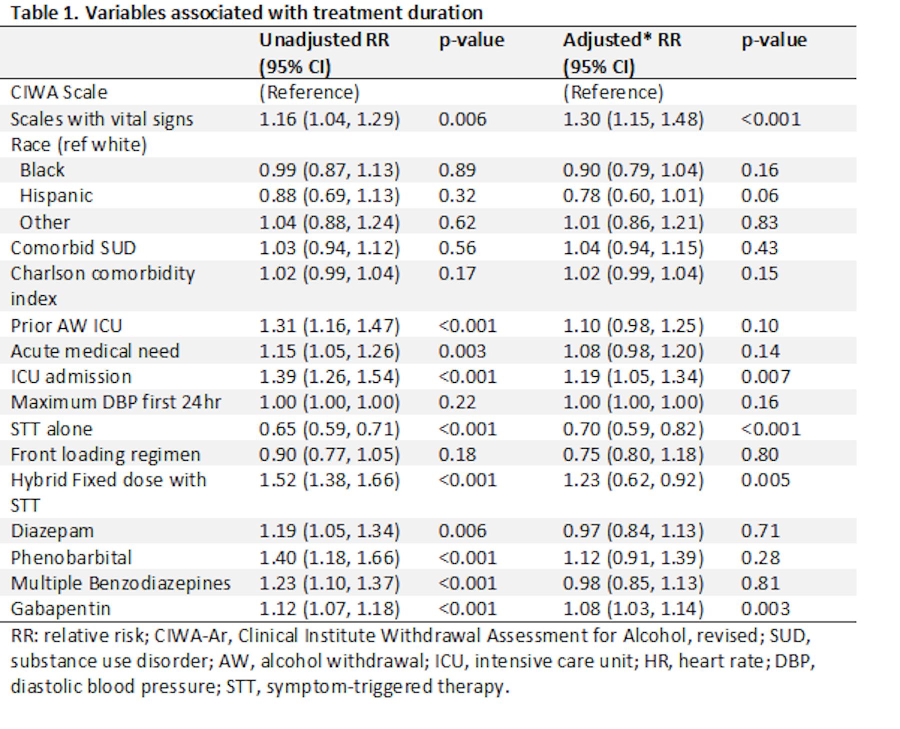Results: In total, 461(78%) patients were managed using CIWA, and 127 (22%) patients were managed using symptom scales that included vital signs. The average duration of treatment was 3.4 days (SD, 2.0) for patients managed with CIWA compared to 3.9 days (SD, 2.0) for patients managed with scales incorporating vital signs (P= 0.007). On multivariable analysis, duration of treatment remained greater using scales with vital signs (RR 1.30, 95% CI, 1.15-1.48). There was no difference in rate of complicated withdrawal (OR 1.00, 95% CI, 0.41-2.46).