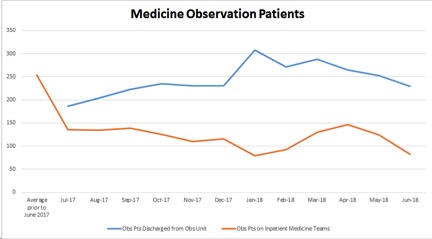 Background: Over the past 50 years, observation status patients have been cared for in a variety of settings: in the emergency department, on inpatient floors, and in dedicated observation units. At our medical center, inpatient teams have traditionally cared for observation patients on medical wards. Patients were often unaware of their admission status until they received a Medicare Outpatient Observation Notice (MOON) as required by the recent Notice of Observation Treatment and Implication for Care Eligibility (NOTICE) Act. The diagnostic evaluation and treatment provided to observation patients was indistinguishable from that provided to inpatients. This model led to less efficient observation care with longer length of stays.