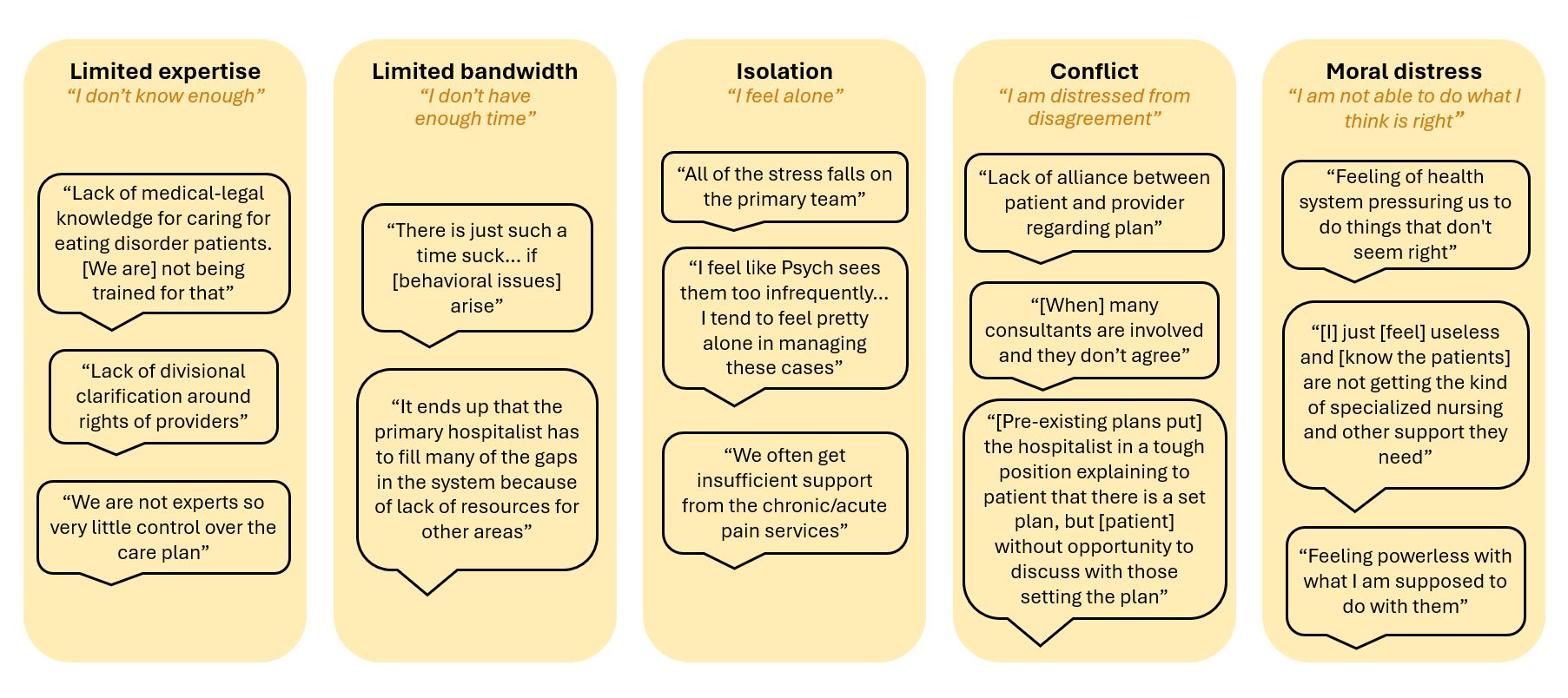 Results: A total of 46 hospitalists (26%) completed the survey. The distribution of clinical experience in hospital medicine as attendings varied across respondents, with 24% having had >10 years of experience, 11% having had 6-10 years of experience, 18% having had 2-5 years of experience, and 13% having had 0-1 year of experience. 11 types of complex patients and clinical scenarios were identified as particularly challenging for hospitalists to care for. Hospitalists ranked the clinical scenarios they would most benefit from additional resources and support (Figure 1). The clinical scenarios that hospitalists identified as being most challenging to manage included patients with chronic pain, patients with behavioral or violence concerns, patients with active psychiatric illness, and patients and families with challenging dynamics. When stratified by years of clinical experience, hospitalists on average still identified the same clinical scenarios in their top three ranked choices. Common themes were identified that contribute to challenges in caring for these patient types and scenarios, and include limited expertise, limited bandwidth, feelings of isolation, distress associated with conflict, and moral distress (Figure 2).