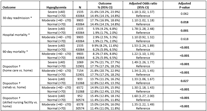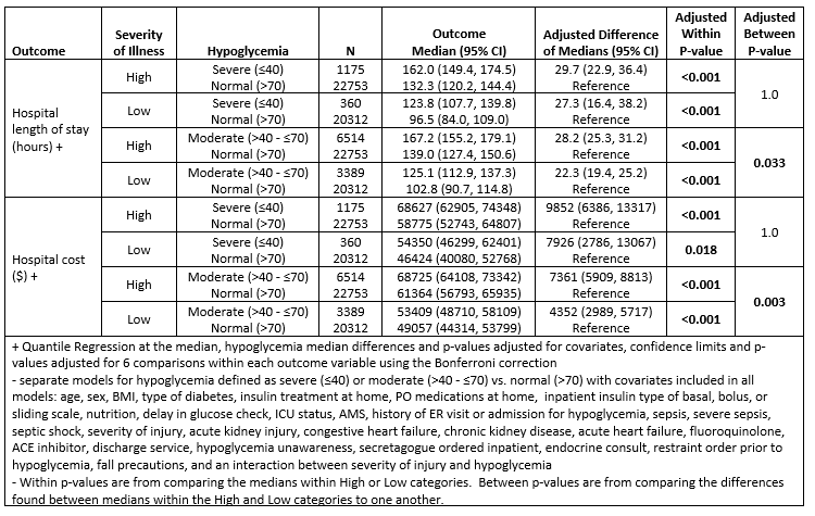 Background: Inpatient hypoglycemia (HG) is common and often avoidable, associated with poor outcomes and high costs, and its prevention reflects hospital performance. We investigated its risk factors and impact on mortality, hospital length of stay (LOS), charges, and readmissions. We defined HG as glucose ≤40 mg/dl (severe), >40 – ≤70 mg/dl (moderate), or euglycemia >70 mg/dl.