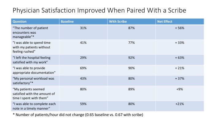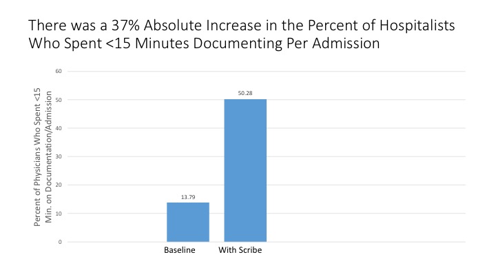 Description: At baseline, only 13% of hospitalists reported spending less than 15 minutes on documentation per admission. After the pilot, 50% of hospitalists reported this when paired with a scribe. There was also an increase in the percent of hospitalists who reported spending time with patients without feeling rushed (41% vs. 77%), an increase in the percent of hospitalists who completed their admission shift satisfied with their work (29% vs. 92%), and an increase in the percent of hospitalists who were satisfied with their documentation (69% vs. 90%). Significantly, there was a 56% absolute increase in the percent of hospitalists who felt the number of patient encounters was manageable (31% vs. 87%), while the actual number of patients was similar (0.65 patients/hour at baseline vs. 0.67 patients/hour).