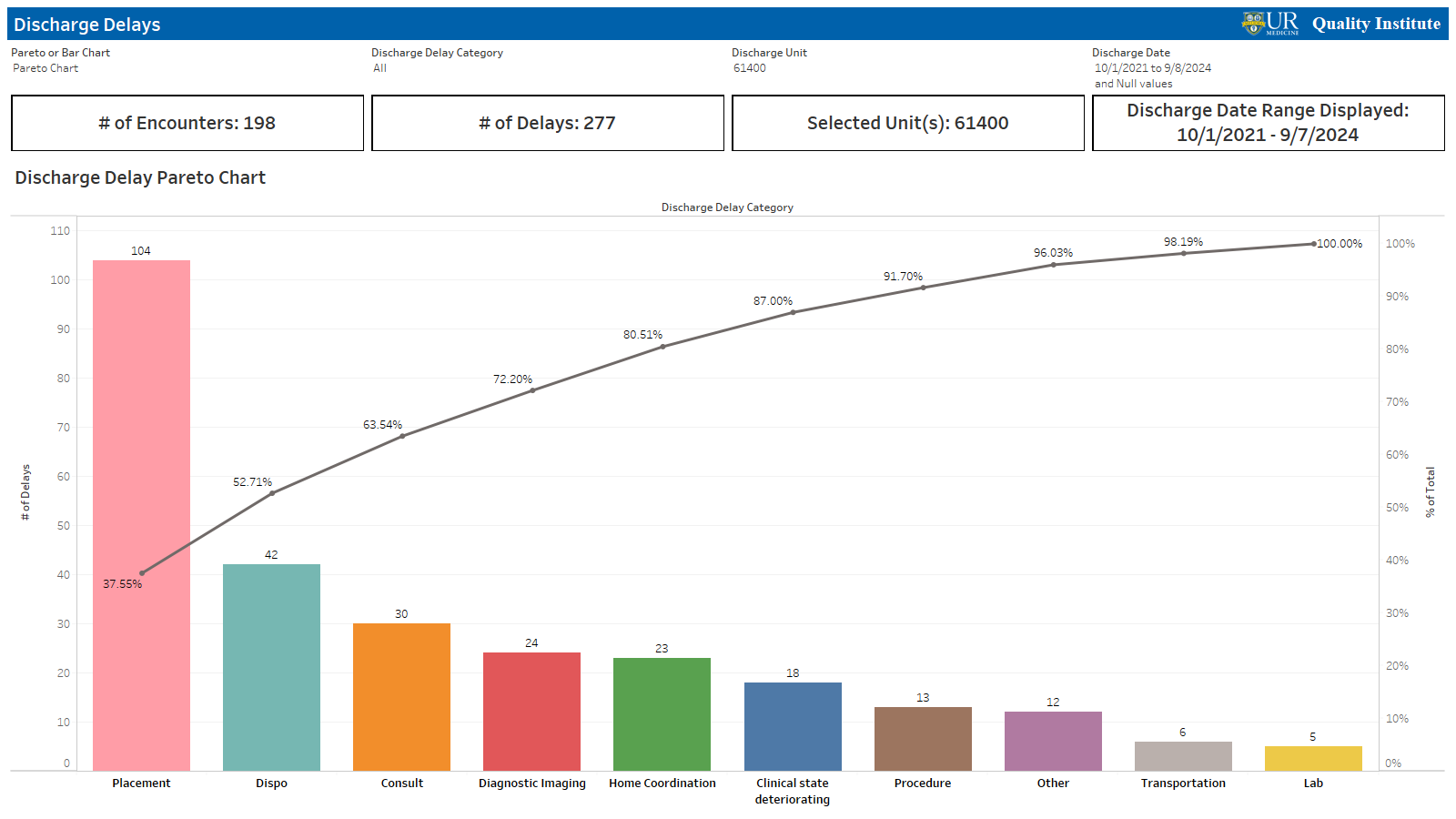 Results: Since the pilot initiation in November 2023, the percentage of documented DDs for patients discharged beyond the MRDD was sustained above the target of 10% and peaked at 24% in February 2024. (Figure 1) Data demonstrated a sustained shift above our median center line for six consecutive months, demonstrating significance. While in July 2024 the entry dropped to 8%, it has subsequently returned to ≥ 10%. We found that the most common barriers to discharge include placement (39%, specifically bed availability), disposition changes (15.5%, specifically unsafe discharge), consults (11.6%, specifically physical therapy (PT)), and imaging (8.1%, specifically echocardiogram (Echo) and magnetic resonance imaging (MRI)). (Figure 2) MRDD entry was tracked as a balancing measure, with a grace period for entry of up to two days beyond the MRDD. In February of 2024, the percentage of DD entry and the percentage of patients discharged two days after the MRDD converged at 24.5%. These results showed us that the MRDD was updated and utilized to alert providers to update the DDs.