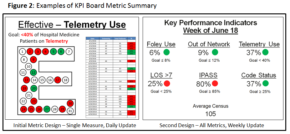 Conclusions: KPI boards are a novel means of displaying current quality data to hospital medicine providers. Weekly, rather than daily, updates were more feasible and better understood by providers. Metric data collection for KPI boards easily supports ongoing and future quality improvement projects.