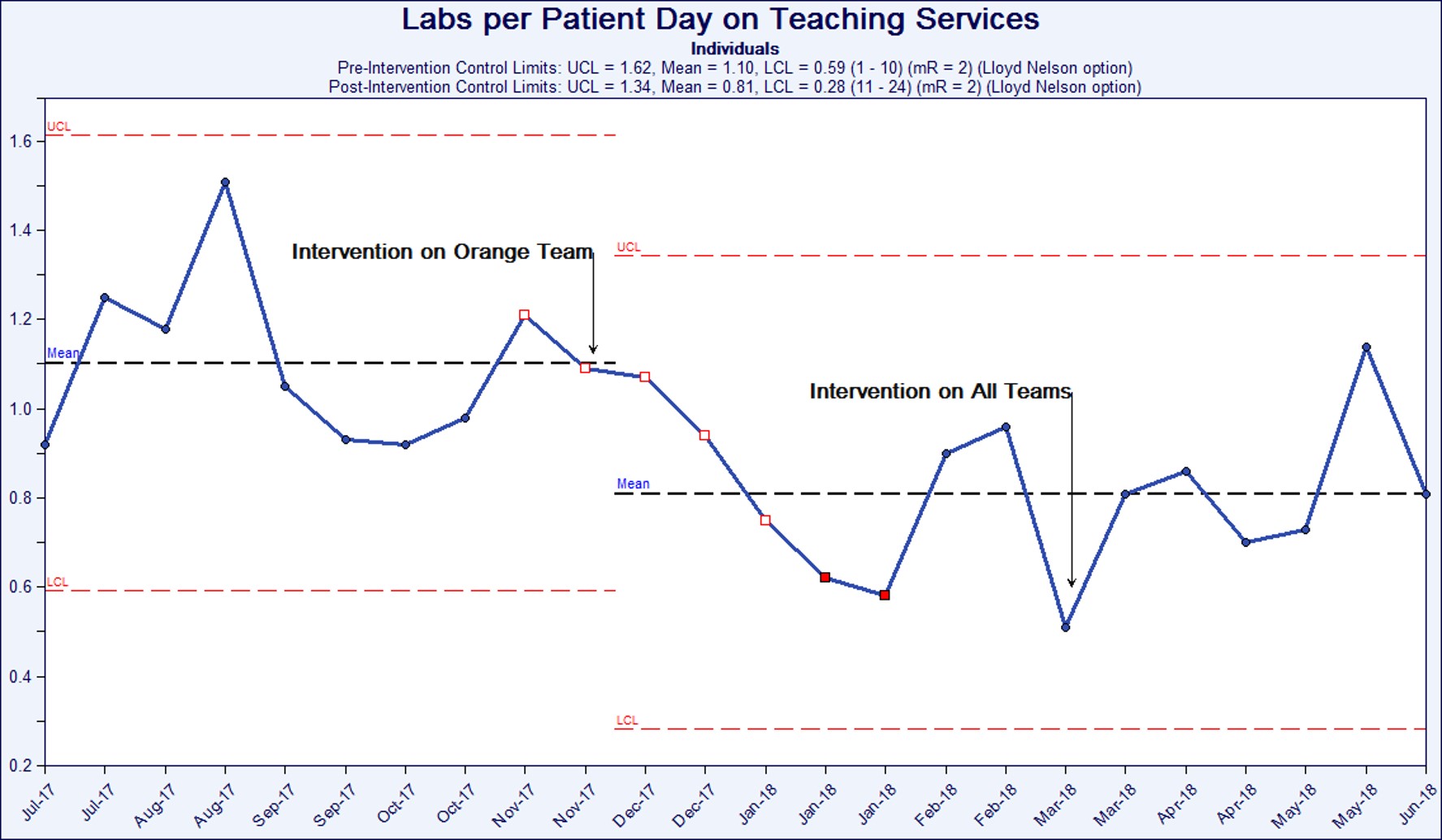 Results: Labs per patient day decreased significantly from a baseline mean of 1.10 labs per patient day to 0.81 by the end of the intervention period (One Tailed T-Test, p < 0.005). For 24 consecutive weeks post-intervention, labs per patient day fell below the pre-intervention mean, indicating a statistically significant shift. The first block when the intervention was applied to all teaching services, special cause variation was observed, as labs were reduced to 0.51 labs per patient day.