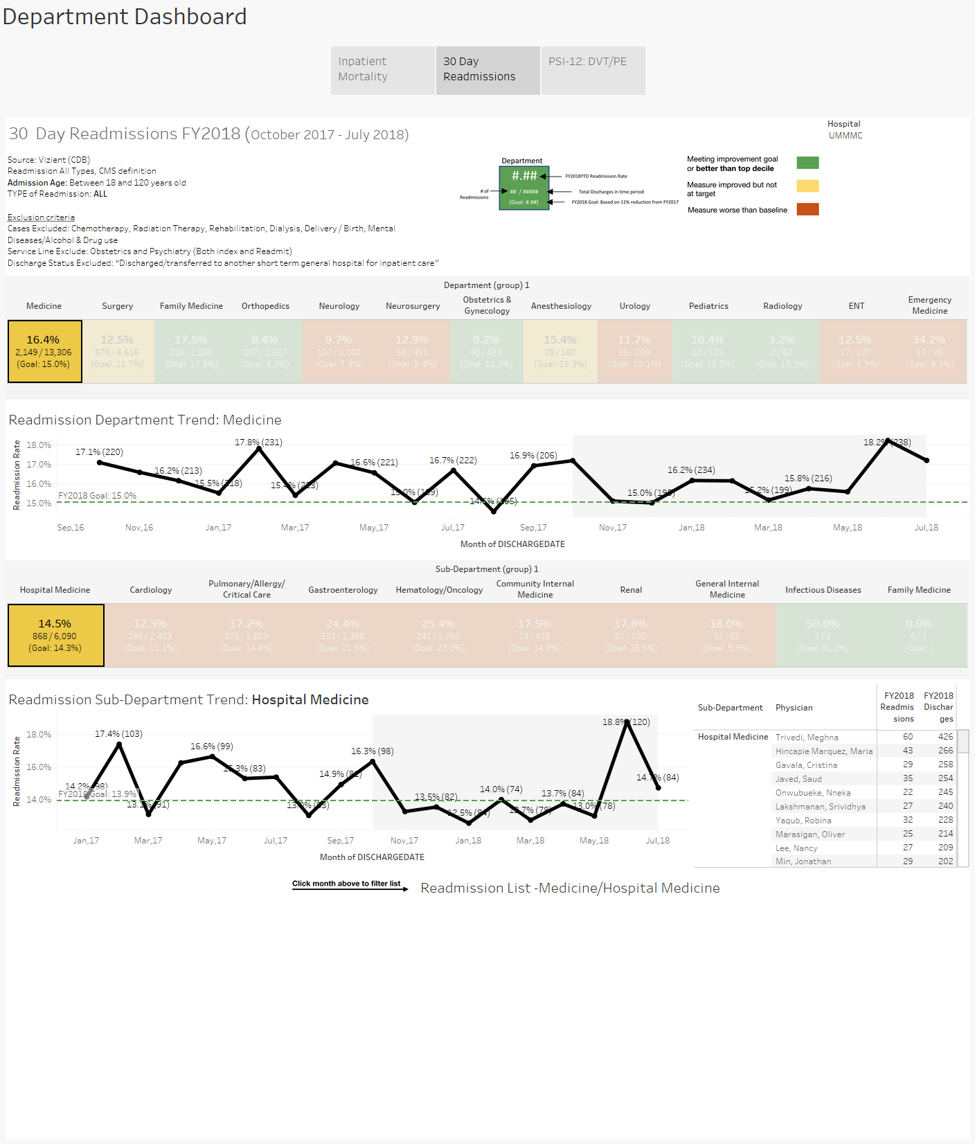Background: Readmission rate at UMASS Memorial Hospital medicine division is high at 15.5%. Majority of patients are admitted to Hospitalist service. Given the challenges in obtaining real time readmission data, physician engagement is poor. Etiology of most of the readmissions gets attributed to system related issues. To improve physician engagement, the concept of weekly Idea board meetings (based on lean methodology) around the issue of readmissions was started in October 2017.