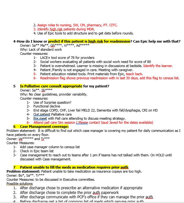 Description: Idea board was set up in the Hospitalist office with theme of readmissions. All the Hospitalist were trained regarding the function of Idea board. Basic information regarding lean methodology and problem solving based on 5 WHY and PDSA was given and was used through out the year. Total of 26 Hospitalists participated in weekly meetings for 15 minutes through out the year. On call Hospitalist attended the weekly meeting in person and rest of the group was emailed about the progress and action items. Total of 24 new ideas came on the variety of topics including use of multidisciplinary rounds, early identification of patients for palliative care and how to use LACE+ score. Out of these 12 ideas were fully implemented, 7 of them are in phase of PDSA cycles of implementation and 5 are in parking lot and are on hold. Hospitalist felt they were involved in this key initiative resulting in overall decrease in readmission rate by 5%.