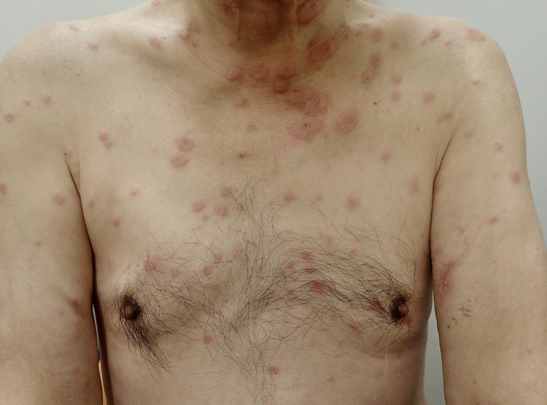 Discussion: VEXAS syndrome predominantly affects older men and is characterized by UBA1 somatic variants, inflammatory manifestations, hematological abnormalities, and vacuoles in myeloid and erythroid precursors. Its primary clinical features are skin lesions (83%), fever (64%), weight loss (62%), lymphadenopathy (34%), and arthralgia (27%). Skin symptoms are common and diverse, ranging from red or violaceous papules to inflammatory edematous papules, erythematous plaques, and livedo racemosa. Nearly all affected patients show vacuoles in myeloid and erythroid progenitors. Furthermore, myelodysplastic syndromes occur frequently in affected patients, with incidences of 25%–55%. High-dose glucocorticoids remain the only effective treatment for VEXAS syndrome, although long-term use often leads to resistance. Alternative effective treatments remain unidentified.