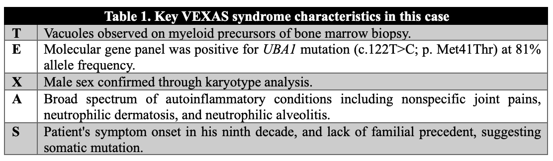 Case Presentation: An 83-year-old male with a past medical history of light chain MGUS, macrocytic anemia, and cytopenias, arrived at the emergency room presenting with hemorrhagic bullae on his left hand. He reported intermittent fever episodes and chronic, nonspecific joint pain. Admission labs indicated hemoglobin of 7.6, MCV of 114.1, platelet count of 109, and WBC count of 2.4 (ANC of 1.25). His CRP level was significantly elevated at 83.8. Initial treatment addressed a superficial skin infection of the hemorrhagic bullae, which yielded Staphylococcus epidermidis from a bacterial swab.A punch biopsy of the bulla identified a diffuse neutrophilic dermal infiltrate, scattered histiocyte cells, and dermal hemorrhage throughout the superficial and deep dermis, consistent with neutrophilic dermatosis. CT imaging revealed patchy multifocal opacities and clustered nodularity in the lungs, as well as mediastinal lymphadenopathy – findings suggestive of neutrophilic alveolitis. Subsequent bone marrow biopsy revealed hypercellularity (60%), pronounced myeloid and histiocytic hyperplasia, and an atypical immune cell population. Notably, vacuoles were observed in granulocytic and erythroid precursors, suggesting a clonal myeloid process. Flow cytometry identified 3% blasts with an immature myelomonocytic immunophenotype, expressing a range of CD markers and surface light chains. Cytogenetics presented a normal male karyotype, and a UBA1 mutation was identified (81%).These findings were deemed consistent with VEXAS syndrome. The patient commenced a regimen of prednisone, tapering from an initial dose of 60 mg daily to 10 mg daily, with potential consideration of tocilizumab as a steroid-sparing option upon symptom relapse. Subsequent follow-ups have indicated symptom remission under this treatment regime.