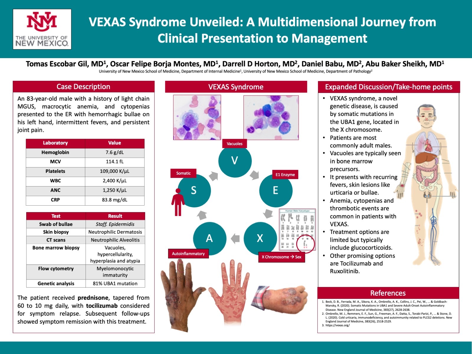 Conclusions: In summary, our case highlights the complex nature of VEXAS syndrome. With its diverse clinical profile and limited treatment options, this condition poses challenges for both clinicians and patients. The diagnostic journey of our patient, characterized by a comprehensive workup and a positive response to glucocorticoids, speaks to the need to approach VEXAS cases on a case-to-case basis. As we look to the future, emerging treatments like Ruxolitinib offer hope, but further research is needed to define the optimal management strategy.