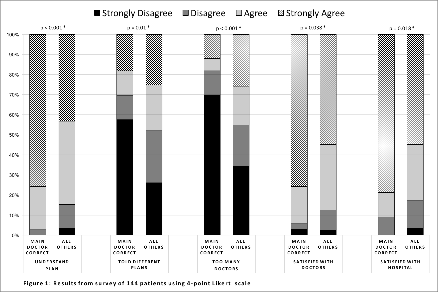 Results: Thirty-three of 144 patients (22.9%) correctly identified (either by name or description) their primary hospitalist, or identified a member of the teaching team as their primary physician. Most patients (89.4%) agreed that knowing their primary provider was important to them, and 77.0% agreed that this would improve their care. Patients who correctly identified their physician were more likely to report understanding their plan of care (97.0% vs 84.7%, p<0.001); less likely to feel as though they had too many physicians involved in their care (18.2% vs 45.0%, p<0.001), and were less likely to feel that they were told different plans of care by different providers (30.3% vs 47.7%, p=0.01). They were also more likely to report satisfaction with their physicians (94.0% vs 87.4%, p=0.04), and with the hospital (90.9% vs 82.9%, p=0.02) (See Figure).