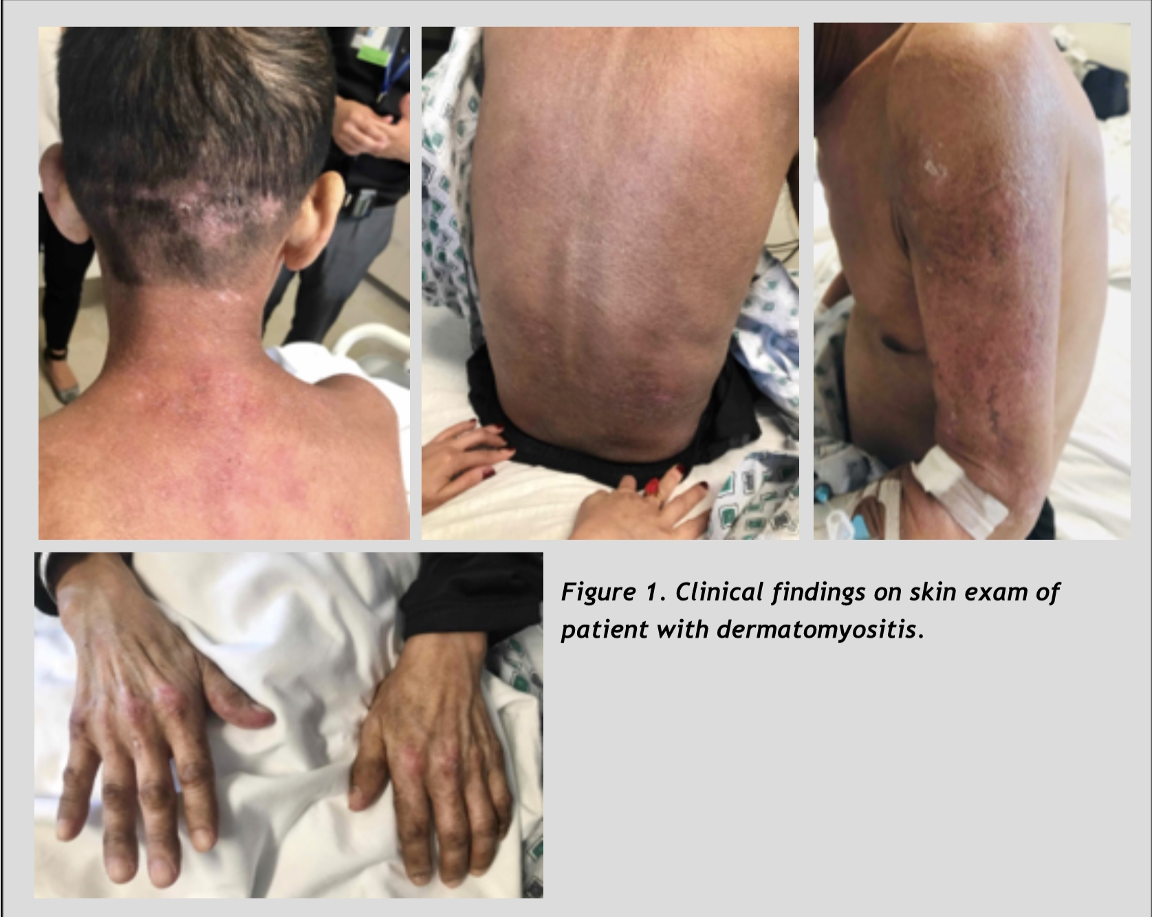 Case Presentation: 49-year-old man with history of alcohol abuse presented with a 3-month history of progressive weakness, weight loss and skin lesions. An outside dermatologist had diagnosed the patient with porphyria cutanea tarda (PTC) one month prior to admission based on characteristic skin findings on physical examination, and elevated urine and serum porphyrin levels. He presented to an outside hospital with failure to thrive, progressive weakness and weight loss despite one month of treatment with Plaquenil. Despite extensive evaluation, no unifying diagnosis was found for the cause of his symptoms. Vitals were stable on transfer. Physical examination was notable for cachexia, erythematous lesions over the MCP joints, and hyperpigmentation of his face, neck, and back. There was proximal weakness of his upper and lower extremities on neurologic exam. His labs were notable for an elevated ESR and CRP, with mildly elevated AST and ALT (with AST > ALT). His CK was normal, comparable to the level tested one month prior. Serum aldolase was elevated. Rheumatology and Dermatology were consulted to evaluate for dermatomyositis. The patient underwent upper extremity skin biopsy, with findings that were consistent with dermatomyositis. MRI of his thighs revealed myositis and muscle biopsy showed tissue necrosis, which confirmed the diagnosis. CT chest/abdomen/pelvis did not show signs of malignancy. Treatment with prednisone was initiated.
