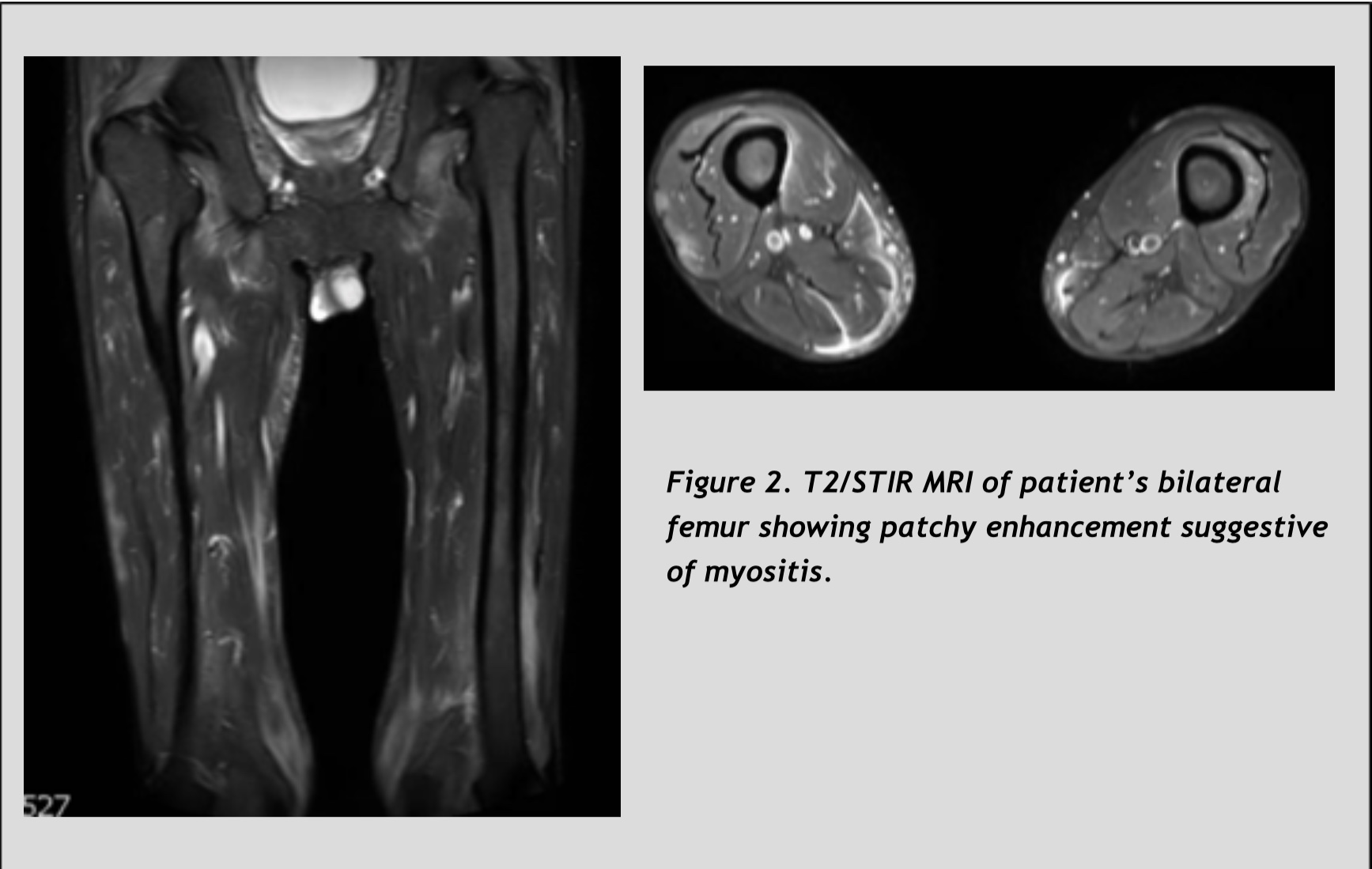 Conclusions: This case illustrates the importance of checking aldolase as well as CK to make the diagnosis of myositis, as CK and other muscle enzymes may not be elevated.