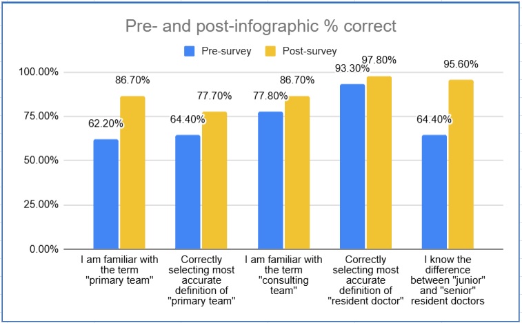 Description: A single center pilot study was conducted with 45 patients admitted to a large urban academic medical center between February 2024 and August 2024. Inclusion criteria required that they read and write English fluently to participate, as our infographic is currently only in English. They also must be alert and oriented and have the capacity to make their own medical decisions in order to ensure that they could properly understand the materials. Patients were first given a pre-survey to identify their base knowledge of the various healthcare roles. They were then introduced to the infographic. Immediately after, they were given the post-survey to identify any improvements in knowledge. The pre- and post-surveys were identical to each other, except that the post-survey had two additional questions which asked the patient to rate the infographic’s effectiveness, as well as provide open-ended feedback.