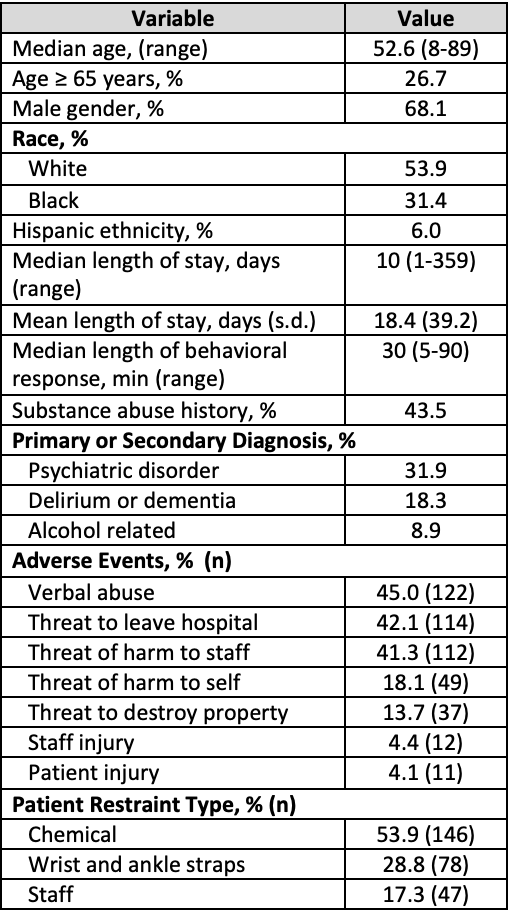 Results: There were 271 BRs (~23 per month) during the 1-year study period and 1 injury each month occurred for both patients and hospital staff during BR episodes. Hospital staff were verbally threatened with physical harm ~41% of the time and some form of patient restraint (chemical or mechanical) was used in ~2 of every 3 cases (Table 1). In multivariate analysis, age ≥ 65 years (p=0.036) and patient threatening harm to staff (p=0.003) were associated with increased likelihood of both physical and chemical restraints. Table 2 is a sample of chart narratives from BR episodes.