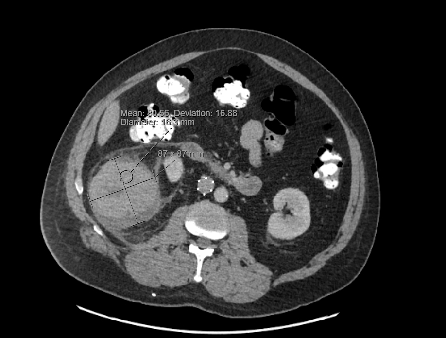 Case Presentation: A 60-year-old man presented with four days of right upper quadrant pain and right flank pain. He had a past medical history that included hypertrophic cardiomyopathy with pacemaker and ICD, hyperlipidemia, atrial flutter, hypertension, prior pulmonary embolism status post IVC filter, and a known renal cyst first identified greater than ten years prior. He had recently returned from a trip to Costa Rica, where he experienced a sudden, severe onset of RUQ abdominal pain with radiation to his right flank. The pain was constant but worse with movement and inspiration and was initially attributed to food poisoning by the patient. He denied any trauma to the region, particularly given that he had chronic difficulty ambulating due to multiple previous femur surgeries; he ambulated with crutches at baseline. He presented to care due to persistent and progressive pain. Vital signs on presentation were BP 131/81, HR 74, Temp 37.1°C, RR16. Physical exam was notable for RUQ tenderness to deep palpation and notable absence of costovertebral angle tenderness or skin discoloration/ecchymosis. Laboratory findings were notable for leukocytosis of 14.4 x1,000/uL and an initial hemoglobin of 10.1 g/dL from baseline of 12 g/dL. CT imaging showed a heterogeneously hyper-dense lesion in the lower pole of the right kidney measuring up to 9.9cm in size with surrounding stranding and fluid in the right perinephric space, likely reflecting the sequelae of a ruptured hemorrhagic renal cyst though solid component could not be excluded. Confirmation with MRI was delayed due to concerns regarding the patient’s pacemaker and retained spinal stimulator leads. He was normotensive and his hemoglobin remained stable through admission, and he was discharged with plans for outpatient MRI and nephrology evaluation.