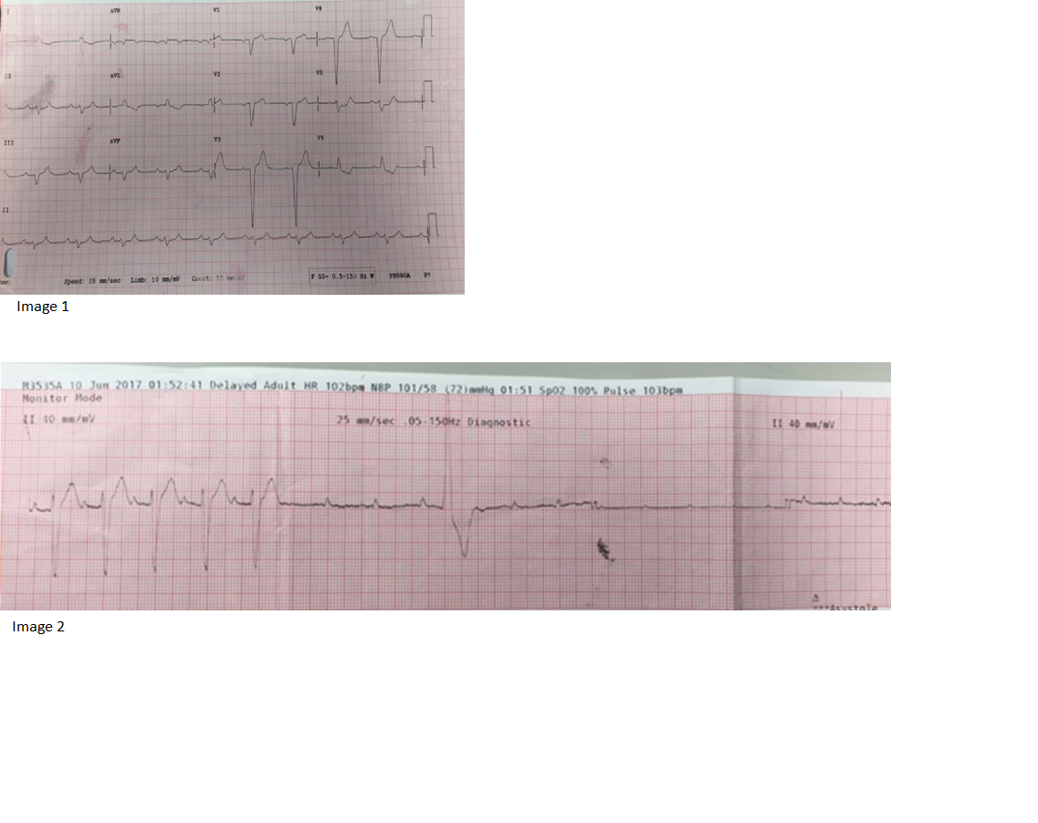 Case Presentation: A 30 year old well male presented with one day history of multiple episodes of loss of consciousness. Each episode lasted several minutes with no preceding warning. There was no limb jerking, tongue biting or confusion. One week prior, he was treated for shingles with oral acyclovir. His temperature was 37.9° Celcius. He was lethargic but oriented. Neurological examination was normal. There were grouped vesicles on the lower back. Electrocardiogram showed left bundle branch block (Image 1) and troponin-T was markedly elevated at 2904 ng/L (usual range 0-29 ng/L). When reviewed by the admitting doctor, he had further episodes of unresponsiveness with transient limb jerking. During the third episode, ventricular standstill was seen on telemetry. (Image 2) He was transferred to coronary care unit for temporary pacing wire insertion. Subsequent troponin levels rose to 3929 ng/L. He was started on intravenous acyclovir for viral myocarditis given the recent onset of shingles. Transthoracic echocardiogram showed impaired left ventricular systolic function with ejection fraction of twenty-seven percent. Coronary angiogram was normal. Magnetic resonance imaging showed regional increase in myocardial signal intensity supportive of acute myocarditis. He required trans-venous pacing for seven days. There was no recurrence of syncope. He was discharged with perindopril and spironolactone. A repeat echocardiogram one month later showed normalisation of left ventricular function.